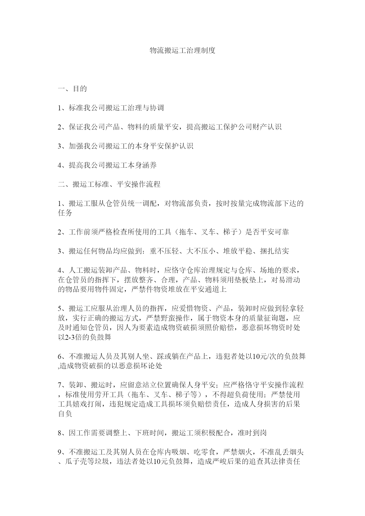 物流搬运工治理制度一、目的1、标准我公司搬运工治理与协调2、保证我公司产品、物料的质量平安,提高搬运工保护公司财产认识3、加强我公司搬运工的本身平安保护认识4、提高我公司搬运工本身涵养二、搬运工标准、平安操作流程1、搬运工服从仓管员统一调配,对物流部负责,按时按量完成物流部下达的任务2、工作前须严格检查所使用的工具(拖车、叉车、梯子)是否平安可靠3、搬运任何物品均应做到:重不压轻、大不压小、堆放平稳、捆扎结实4、人工搬运装卸产品、物料时,应恪守仓库治理规定与仓库、场地的要求,在仓管员的指挥下,摆放整齐、合