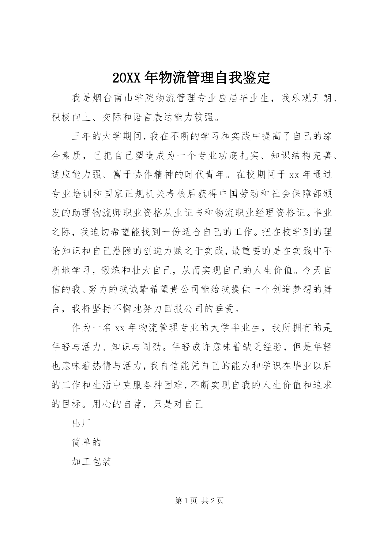 第PAGE\*Arabic\*MERGEFORMAT2页共NUMPAGES\*MERGEFORMAT2页20XX年物流管理自我鉴定我是烟台南山学院物流管理专业应届毕业生,我乐观开朗、积极向上、交际和语言表达能力较强。三年的大学期间,我在不断的学习和实践中提高了自己的综合素质,已把自己塑造成为一个专业功底扎实、知识结构完善、适应能力强、富于协作精神的时代青年。在校期间于xx年通过专业培训和国家正规机关考核后获得中国劳动和社会保障部颁发的助理物流师职业资格从业证书和物流职业经理资格证。毕业之际,我