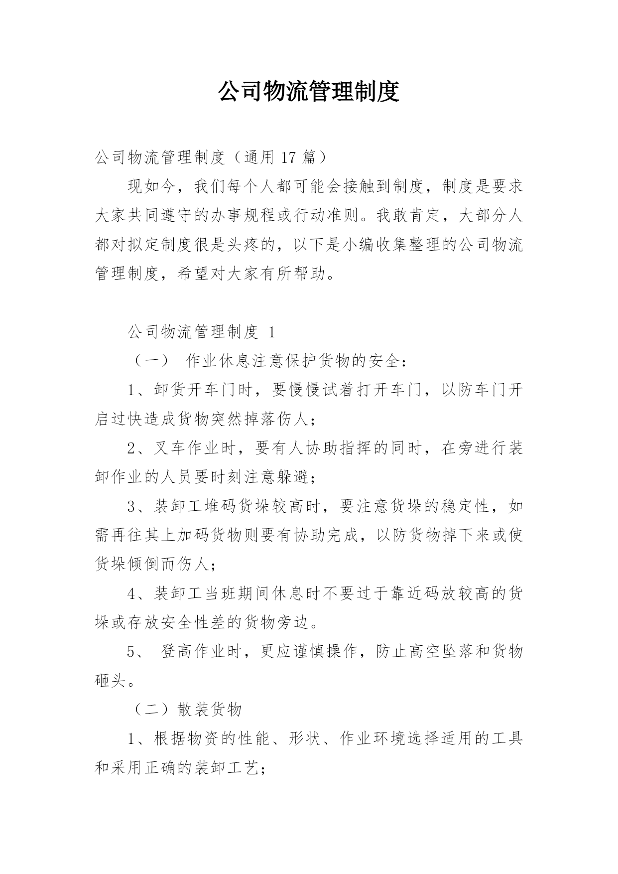 公司物流管理制度公司物流管理制度(通用17篇)现如今,我们每个人都可能会接触到制度,制度是要求大家共同遵守的办事规程或行动准则。我敢肯定,大部分人都对拟定制度很是头疼的,以下是小编收集整理的公司物流管理制度,希望对大家有所帮助。公司物流管理制度1(一)作业休息注意保护货物的安全:1、卸货开车门时,要慢慢试着打开车门,以防车门开启过快造成货物突然掉落伤人;2、叉车作业时,要有人协助指挥的同时,在旁进行装卸作业的人员要时刻注意躲避;3、装卸工堆码货垛较高时,要注意货垛的稳定性,如需再往其上加码货物则要有协助完