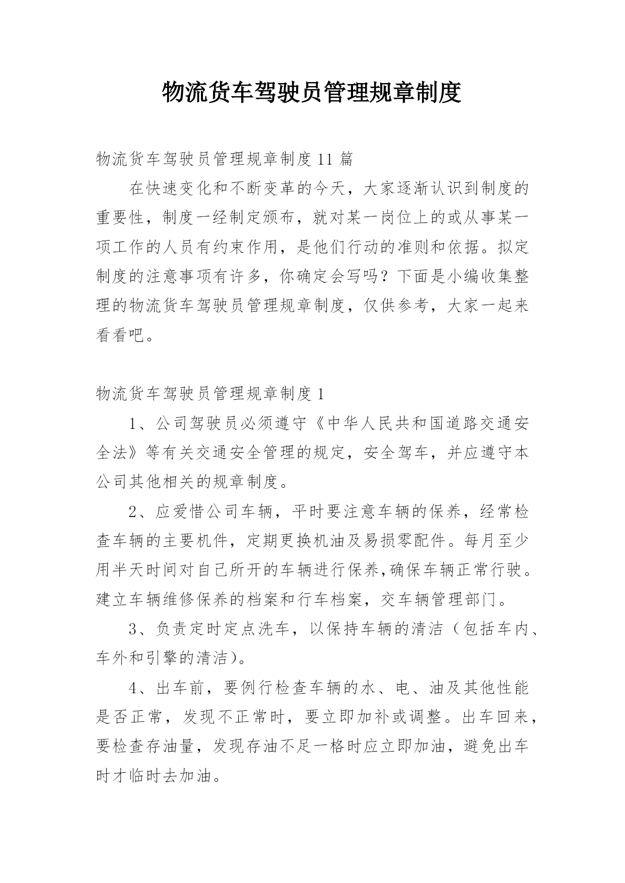 物流货车驾驶员管理规章制度物流货车驾驶员管理规章制度11篇在快速变化和不断变革的今天,大家逐渐认识到制度的重要性,制度一经制定颁布,就对某一岗位上的或从事某一项工作的人员有约束作用,是他们行动的准则和依据。拟定制度的注意事项有许多,你确定会写吗?下面是小编收集整理的物流货车驾驶员管理规章制度,仅供参考,大家一起来看看吧。物流货车驾驶员管理规章制度11、公司驾驶员必须遵守《中华人民共和国道路交通安全法》等有关交通安全管理的规定,安全驾车,并应遵守本公司其他相关的规章制度。2、应爱惜公司车辆,平时要注意车辆的
