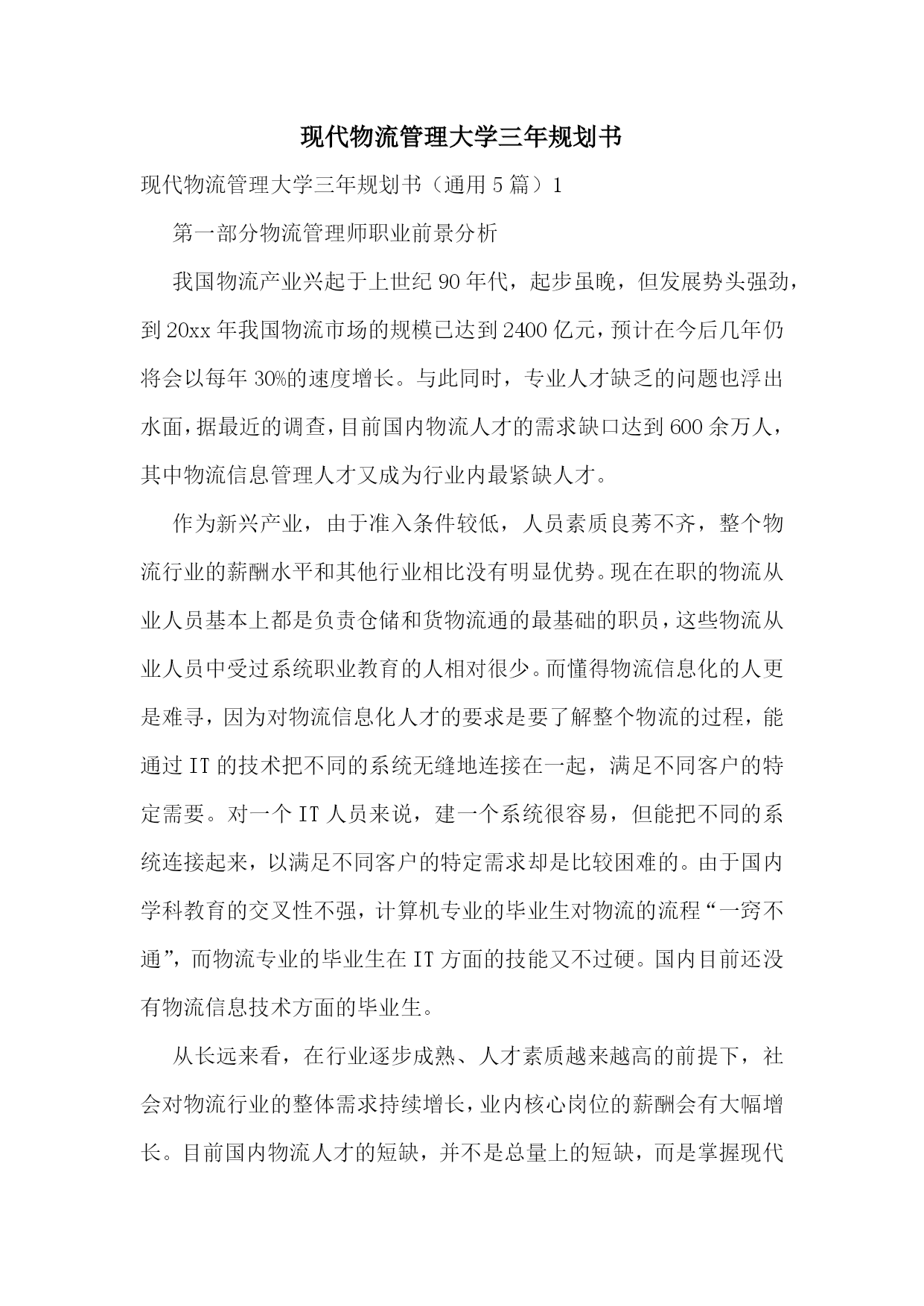 现代物流管理大学三年规划书现代物流管理大学三年规划书(通用5篇)1第一部分物流管理师职业前景分析我国物流产业兴起于上世纪90年代,起步虽晚,但发展势头强劲,到20xx年我国物流市场的规模已达到2400亿元,预计在今后几年仍将会以每年30%的速度增长。与此同时,专业人才缺乏的问题也浮出水面,据最近的调查,目前国内物流人才的需求缺口达到600余万人,其中物流信息管理人才又成为行业内最紧缺人才。作为新兴产业,由于准入条件较低,人员素质良莠不齐,整个物流行业的薪酬水平和其他行业相比没有明显优势。现在在职的物流从业
