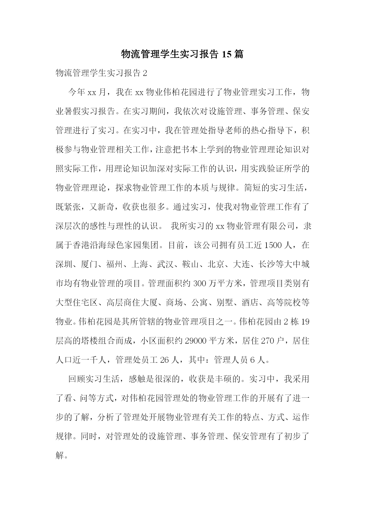 物流管理学生实习报告15篇物流管理学生实习报告2今年xx月,我在xx物业伟柏花园进行了物业管理实习工作,物业暑假实习报告。在实习期间,我依次对设施管理、事务管理、保安管理进行了实习。在实习中,我在管理处指导老师的热心指导下,积极参与物业管理相关工作,注意把书本上学到的物业管理理论知识对照实际工作,用理论知识加深对实际工作的认识,用实践验证所学的物业管理理论,探求物业管理工作的本质与规律。简短的实习生活,既紧张,又新奇,收获也很多。通过实习,使我对物业管理工作有了深层次的感性与理性的认识。我所实习的xx物业