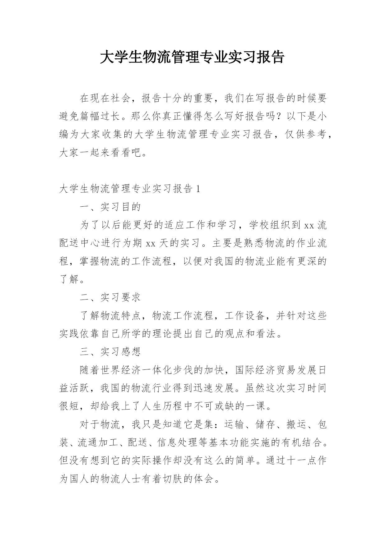 大学生物流管理专业实习报告在现在社会,报告十分的重要,我们在写报告的时候要避免篇幅过长。那么你真正懂得怎么写好报告吗?以下是小编为大家收集的大学生物流管理专业实习报告,仅供参考,大家一起来看看吧。大学生物流管理专业实习报告1一、实习目的为了以后能更好的适应工作和学习,学校组织到xx流配送中心进行为期xx天的实习。主要是熟悉物流的作业流程,掌握物流的工作流程,以便对我国的物流业能有更深的了解。二、实习要求了解物流特点,物流工作流程,工作设备,并针对这些实践依靠自己所学的理论提出自己的观点和看法。三、实习感想