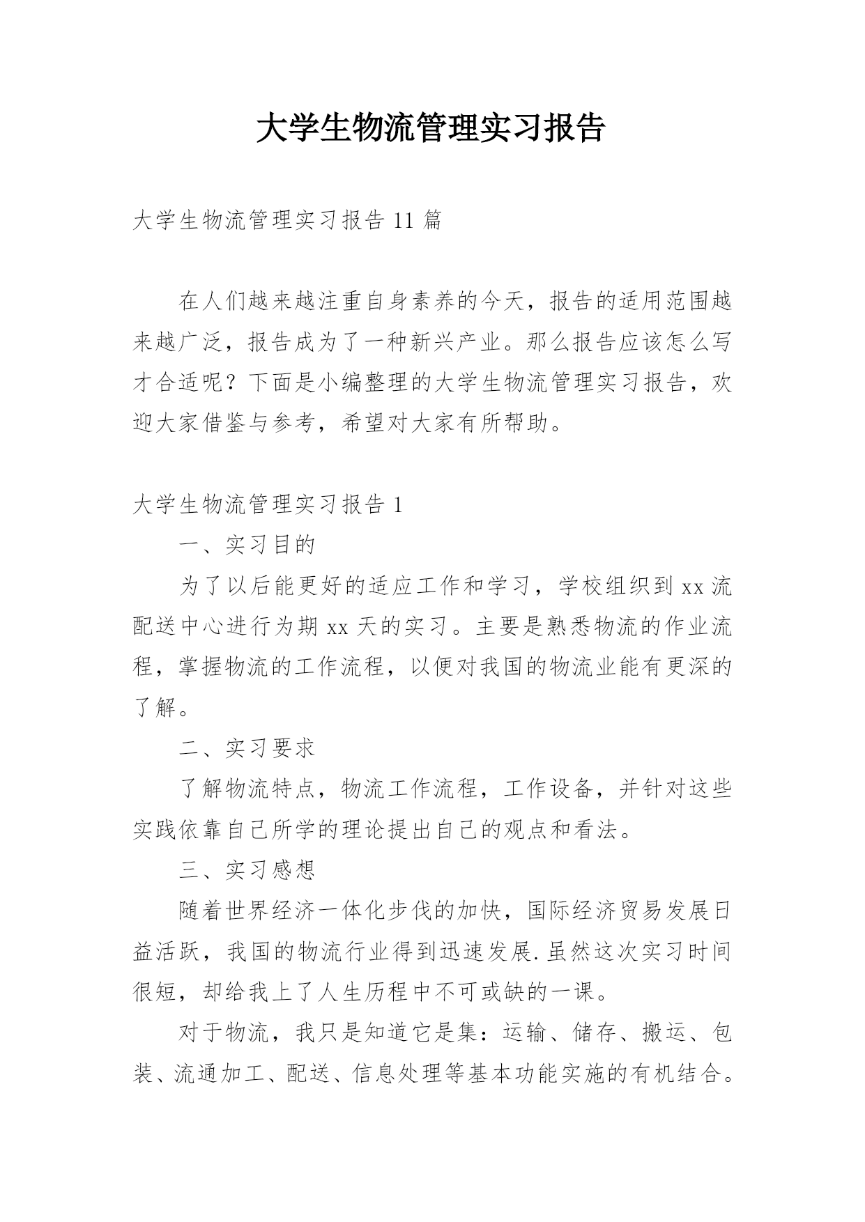 大学生物流管理实习报告大学生物流管理实习报告11篇在人们越来越注重自身素养的今天,报告的适用范围越来越广泛,报告成为了一种新兴产业。那么报告应该怎么写才合适呢?下面是小编整理的大学生物流管理实习报告,欢迎大家借鉴与参考,希望对大家有所帮助。大学生物流管理实习报告1一、实习目的为了以后能更好的适应工作和学习,学校组织到xx流配送中心进行为期xx天的实习。主要是熟悉物流的作业流程,掌握物流的工作流程,以便对我国的物流业能有更深的了解。二、实习要求了解物流特点,物流工作流程,工作设备,并针对这些实践依靠自己所学