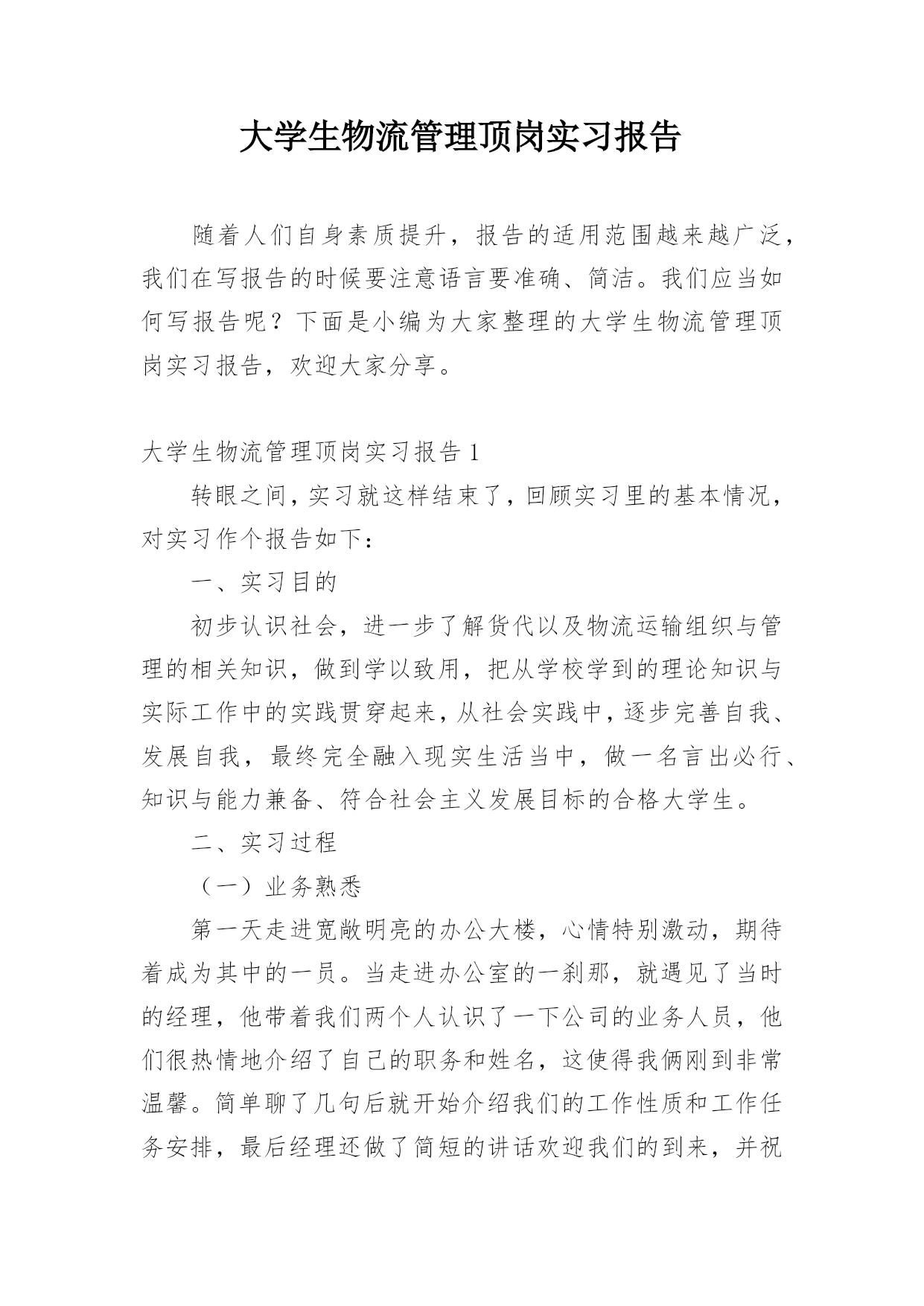 大学生物流管理顶岗实习报告随着人们自身素质提升,报告的适用范围越来越广泛,我们在写报告的时候要注意语言要准确、简洁。我们应当如何写报告呢?下面是小编为大家整理的大学生物流管理顶岗实习报告,欢迎大家分享。大学生物流管理顶岗实习报告1转眼之间,实习就这样结束了,回顾实习里的基本情况,对实习作个报告如下:一、实习目的初步认识社会,进一步了解货代以及物流运输组织与管理的相关知识,做到学以致用,把从学校学到的理论知识与实际工作中的实践贯穿起来,从社会实践中,逐步完善自我、发展自我,最终完全融入现实生活当中,做一名言