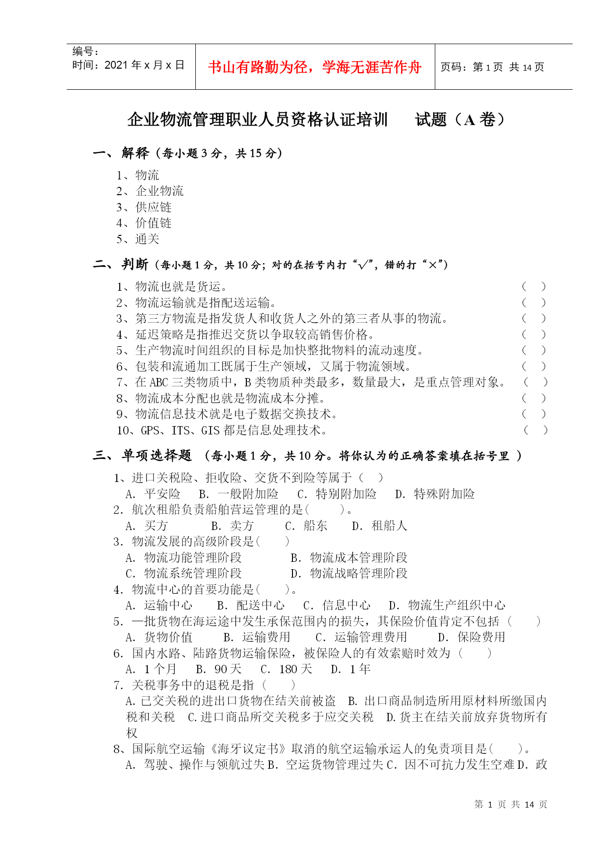 编号:时间:2021年x月x日书山有路勤为径,学海无涯苦作舟页码:第PAGE14页共NUMPAGES14页第PAGE\*MERGEFORMAT14页共NUMPAGES\*MERGEFORMAT14页企业物流管理职业人员资格认证培训试题(A卷)一、解释(每小题3分,共15分)1、物流2、企业物流3、供应链4、价值链5、通关二、判断(每小题1分,共10分;对的在括号内打“√”,错的打“×”)1、物流也就是货运。()2、物流运输就是指配送运输。()3、第三方物流是指发货人和收货人之外的第