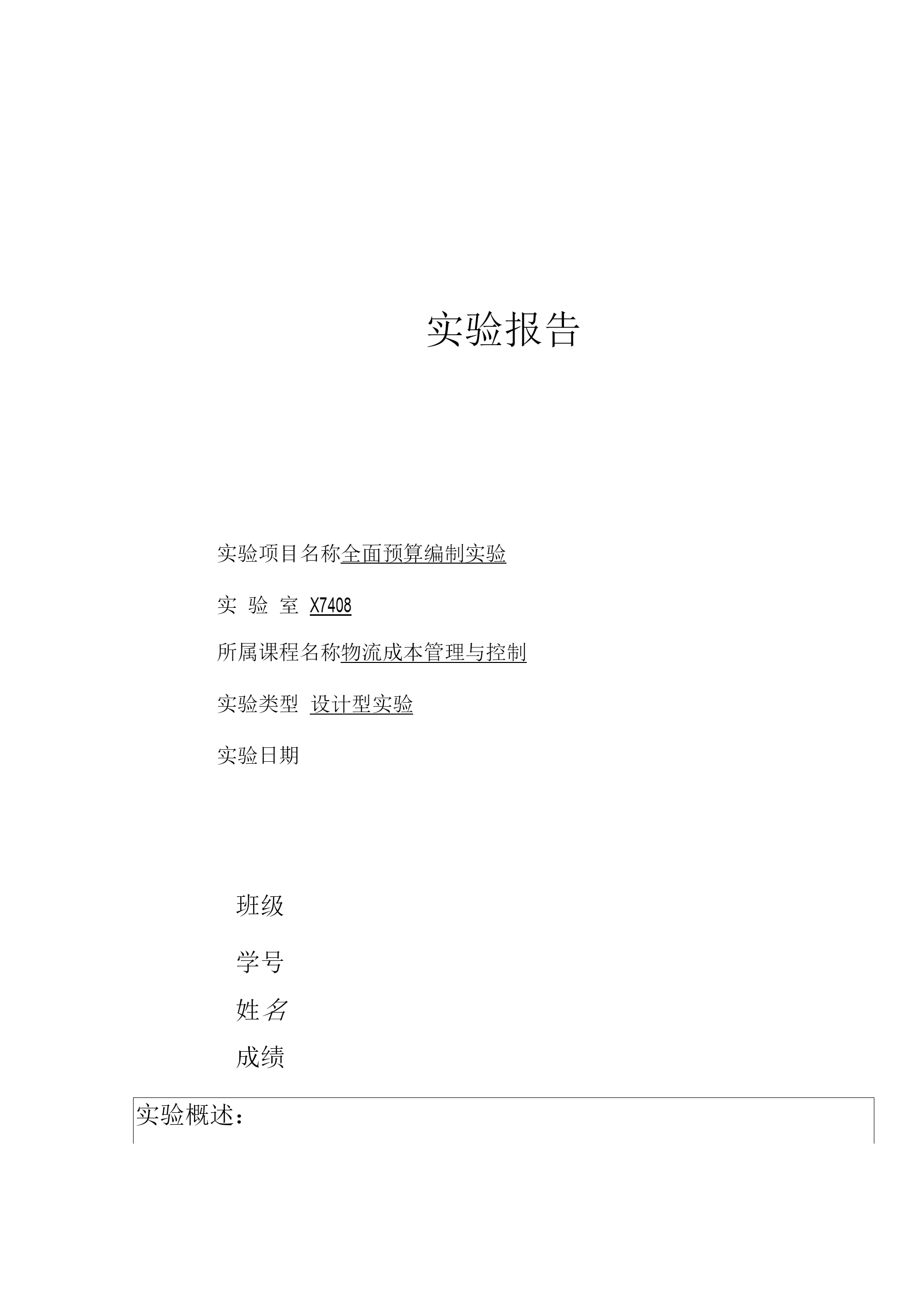 实验报告实验项目名称全面预算编制实验实验室X7408所属课程名称物流成本管理与控制实验类型设计型实验实验日期班级学号姓名成绩实验概述:【实验准备】复习全面预算编制的基本原理【实验目的及要求】掌握全面预算编制的基本原理。掌握全面预算编制各类成本计算表的编制。【实验原理】本实验根据企业的历史数据和市场调查得到的有关资料,以销售预算为编制起点,在销售预算的基础上分别编制生产预算、直接材料预算、直接人工预算、制造费用预算、单位生产成本预算、销售与管理费预算、资本支出预算、现金预算。在各项经营预算的基础上,结合上一