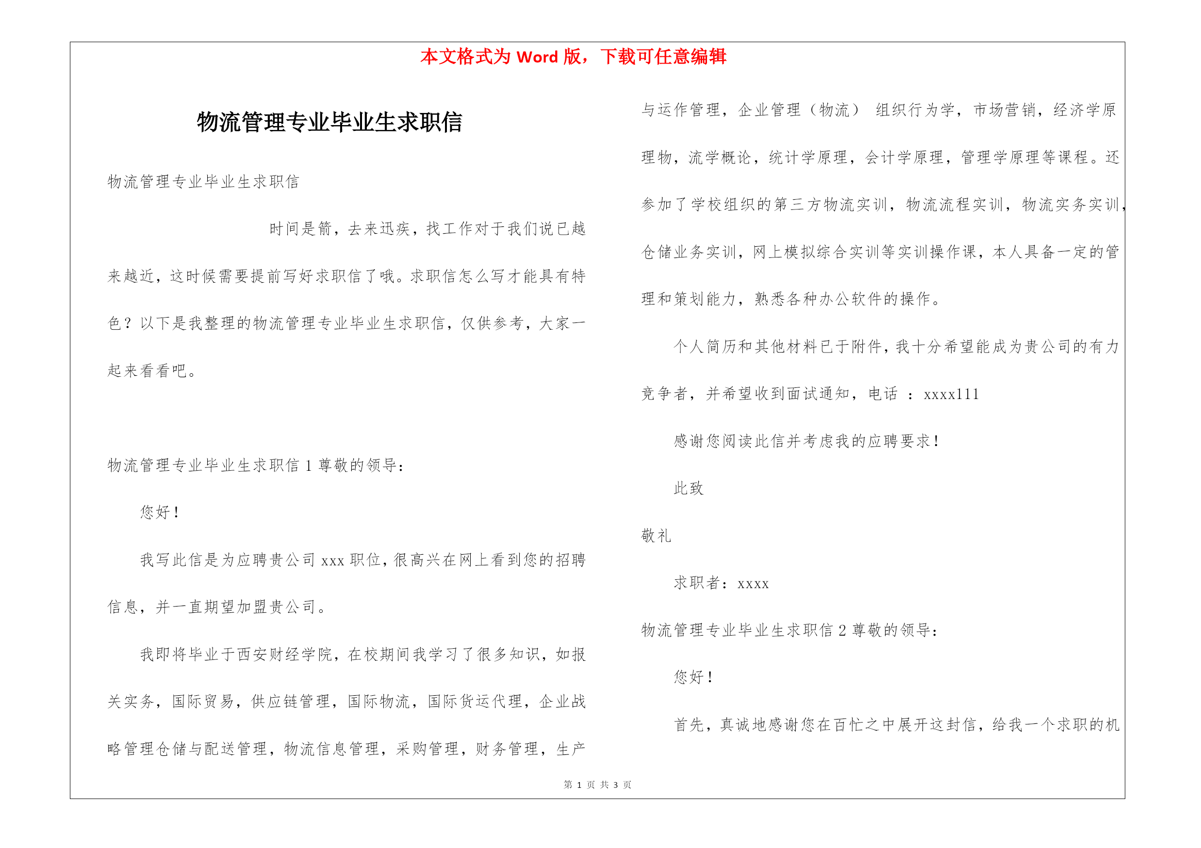 本文格式为Word版,下载可任意编辑第PAGE\*MERGEFORMAT3页共NUMPAGES\*MERGEFORMAT3页物流管理专业毕业生求职信物流管理专业毕业生求职信时间是箭,去来迅疾,找工作对于我们说已越来越近,这时候需要提前写好求职信了哦。求职信怎么写才能具有特色?以下是我整理的物流管理专业毕业生求职信,仅供参考,大家一起来看看吧。物流管理专业毕业生求职信1尊敬的领导:您好!我写此信是为应聘贵公司xxx职位,很高兴在网上看到您的招聘信息,并一直期望加盟贵公司。我即将毕业于西安财经学院