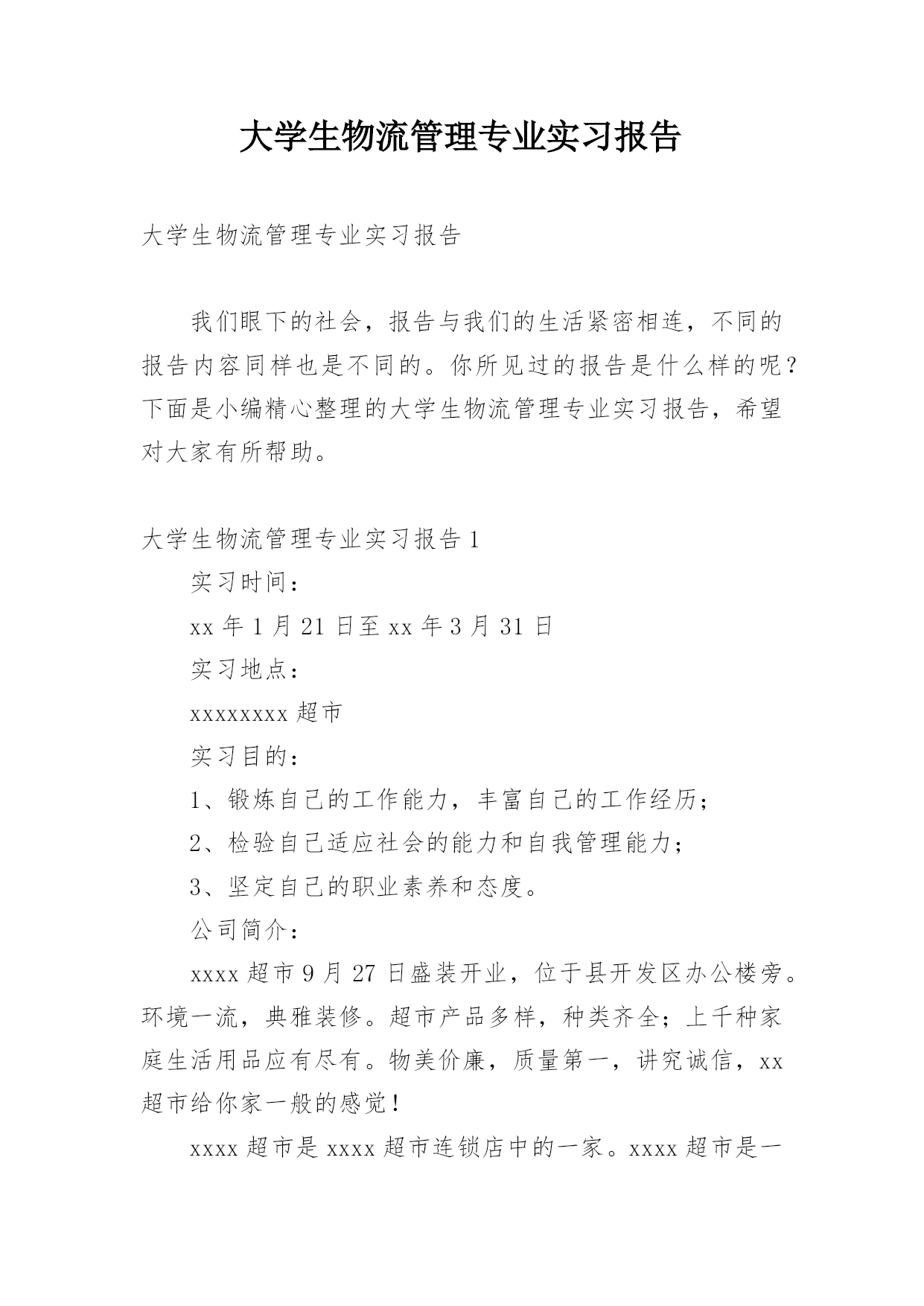 大学生物流管理专业实习报告大学生物流管理专业实习报告我们眼下的社会,报告与我们的生活紧密相连,不同的报告内容同样也是不同的。你所见过的报告是什么样的呢?下面是小编精心整理的大学生物流管理专业实习报告,希望对大家有所帮助。大学生物流管理专业实习报告1实习时间:xx年1月21日至xx年3月31日实习地点:xxxxxxxx超市实习目的:1、锻炼自己的工作能力,丰富自己的工作经历;2、检验自己适应社会的能力和自我管理能力;3、坚定自己的职业素养和态度。公司简介:xxxx超市9月27日盛装开业,位于县开发区办公楼旁