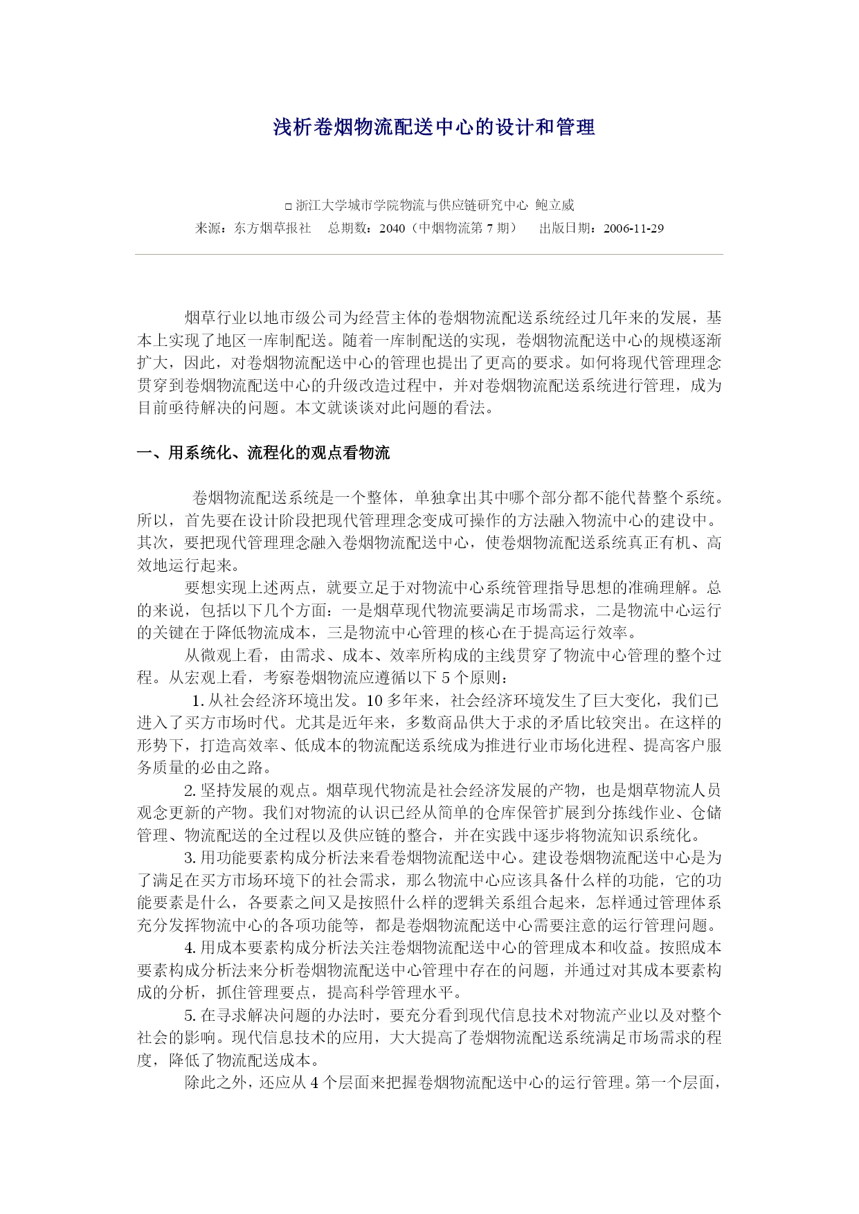 浅析卷烟物流配送中心的设计和管理□浙江大学城市学院物流与供应链研究中心鲍立威来源:东方烟草报社总期数:2040(中烟物流第7期)出版日期:2006-11-29烟草行业以地市级公司为经营主体的卷烟物流配送系统经过几年来的发展,基本上实现了地区一库制配送。随着一库制配送的实现,卷烟物流配送中心的规模逐渐扩大,因此,对卷烟物流配送中心的管理也提出了更高的要求。如何将现代管理理念贯穿到卷烟物流配送中心的升级改造过程中,并对卷烟物流配送系统进行管理,成为目前亟待解决的问题。本文就谈谈对此问题的看法。一、用系统化、流