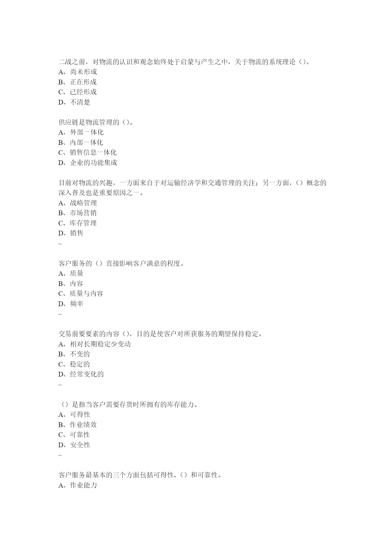 二战之前,对物流的认识和观念始终处于启蒙与产生之中,关于物流的系统理论()。A、尚未形成B、正在形成C、已经形成D、不清楚供应链是物流管理的()。A、外部一体化B、内部一体化C、销售信息一体化D、企业的功能集成目前对物流的兴趣,一方面来自于对运输经济学和交通管理的关注;另一方面,()概念的深入普及也是重要原因之一。A、战略管理B、市场营销C、库存管理D、销售~客户服务的()直接影响客户满意的程度。A、质量B、内容C、质量与内容D、频率~交易前要要素的内容(),目的是使客户对所获服务的期望保持稳定。A、相对