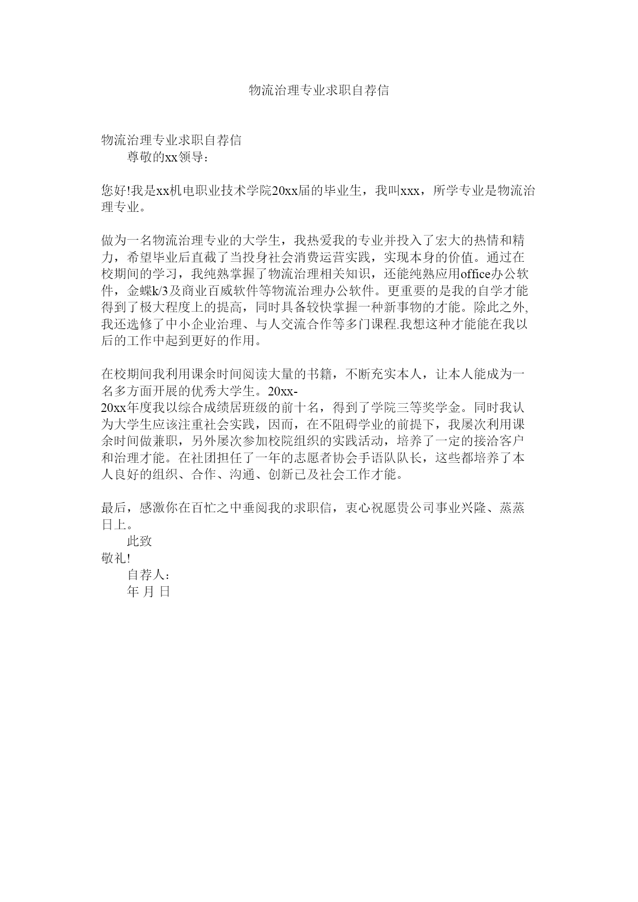 物流治理专业求职自荐信物流治理专业求职自荐信尊敬的xx领导:您好!我是xx机电职业技术学院20xx届的毕业生,我叫xxx,所学专业是物流治理专业。做为一名物流治理专业的大学生,我热爱我的专业并投入了宏大的热情和精力,希望毕业后直截了当投身社会消费运营实践,实现本身的价值。通过在校期间的学习,我纯熟掌握了物流治理相关知识,还能纯熟应用office办公软件,金蝶k/3及商业百威软件等物流治理办公软件。更重要的是我的自学才能得到了极大程度上的提高,同时具备较快掌握一种新事物的才能。除此之外,我还选修了中小企业治
