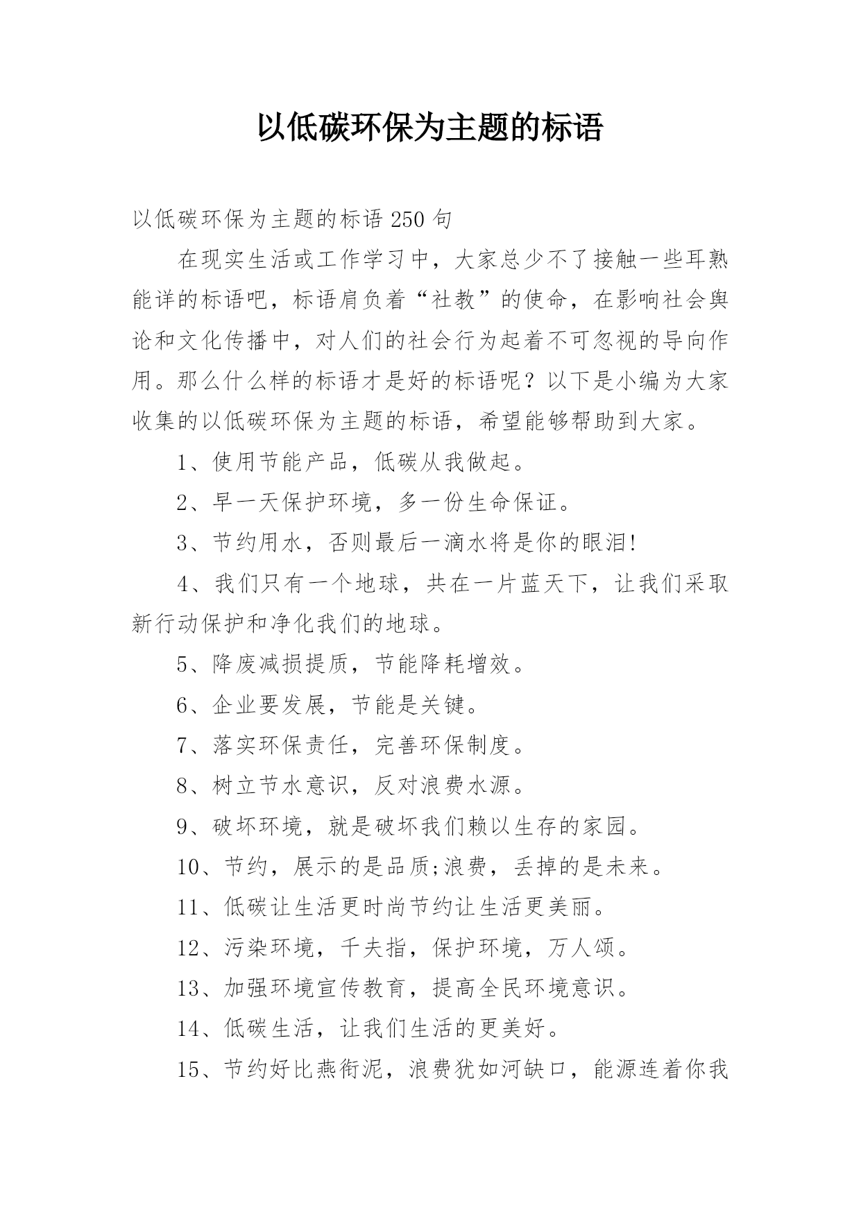 以低碳环保为主题的标语以低碳环保为主题的标语250句在现实生活或工作学习中,大家总少不了接触一些耳熟能详的标语吧,标语肩负着“社教”的使命,在影响社会舆论和文化传播中,对人们的社会行为起着不可忽视的导向作用。那么什么样的标语才是好的标语呢?以下是小编为大家收集的以低碳环保为主题的标语,希望能够帮助到大家。1、使用节能产品,低碳从我做起。2、早一天保护环境,多一份生命保证。3、节约用水,否则最后一滴水将是你的眼泪!4、我们只有一个地球,共在一片蓝天下,让我们采取新行动保护和净化我们的地球。5、降废减损提质,