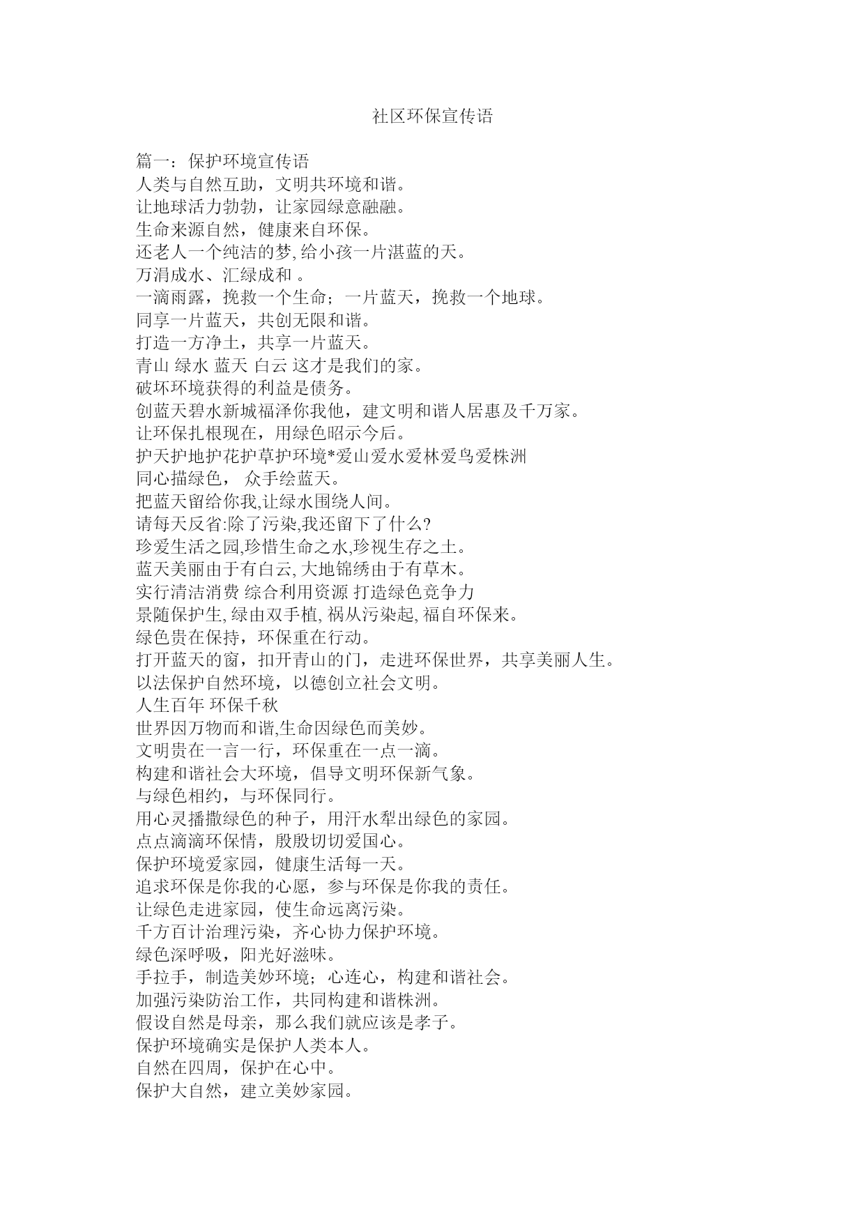 社区环保宣传语篇一:保护环境宣传语人类与自然互助,文明共环境和谐。让地球活力勃勃,让家园绿意融融。生命来源自然,健康来自环保。还老人一个纯洁的梦,给小孩一片湛蓝的天。万涓成水、汇绿成和。一滴雨露,挽救一个生命;一片蓝天,挽救一个地球。同享一片蓝天,共创无限和谐。打造一方净土,共享一片蓝天。青山绿水蓝天白云这才是我们的家。破坏环境获得的利益是债务。创蓝天碧水新城福泽你我他,建文明和谐人居惠及千万家。让环保扎根现在,用绿色昭示今后。护天护地护花护草护环境*爱山爱水爱林爱鸟爱株洲同心描绿色,众手绘蓝天。把蓝天留