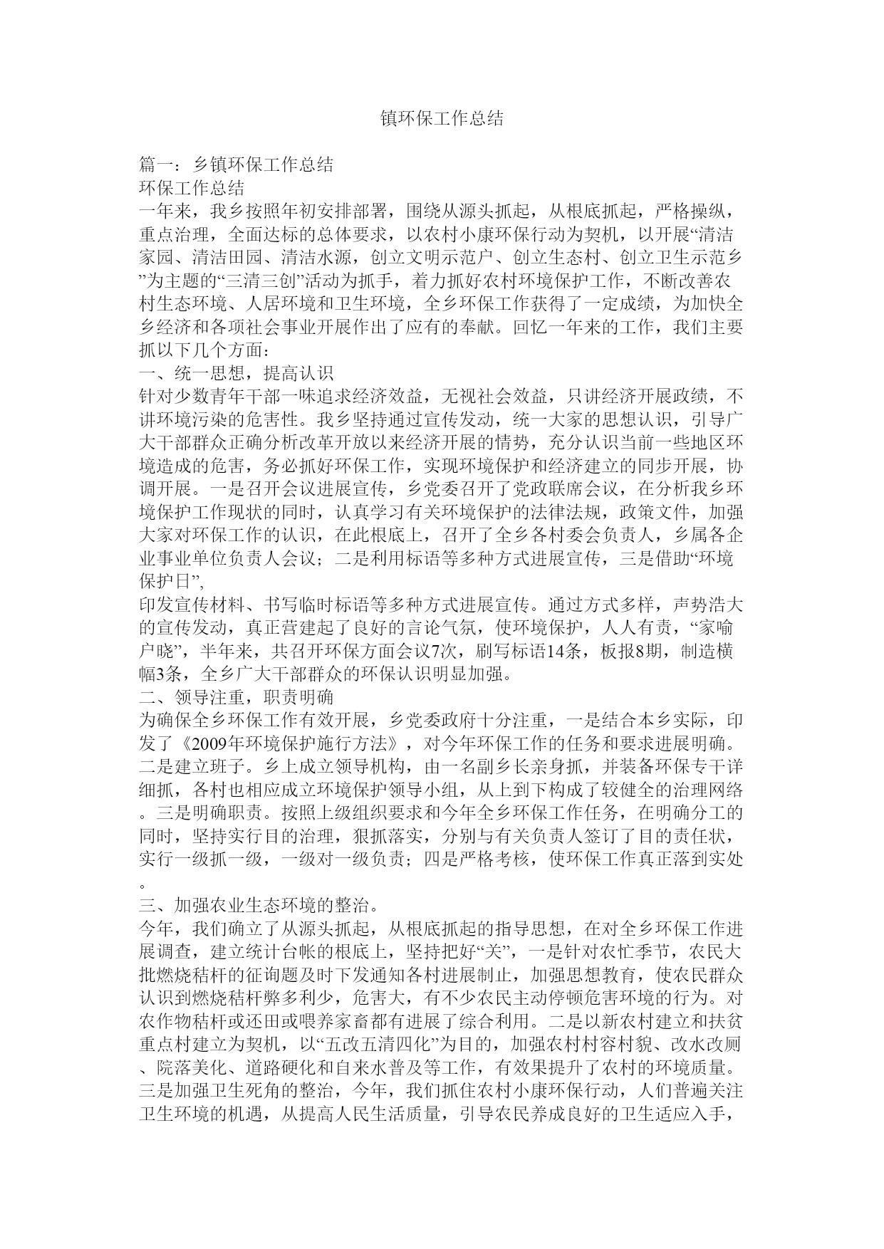 镇环保工作总结篇一:乡镇环保工作总结环保工作总结一年来,我乡按照年初安排部署,围绕从源头抓起,从根底抓起,严格操纵,重点治理,全面达标的总体要求,以农村小康环保行动为契机,以开展“清洁家园、清洁田园、清洁水源,创立文明示范户、创立生态村、创立卫生示范乡”为主题的“三清三创”活动为抓手,着力抓好农村环境保护工作,不断改善农村生态环境、人居环境和卫生环境,全乡环保工作获得了一定成绩,为加快全乡经济和各项社会事业开展作出了应有的奉献。回忆一年来的工作,我们主要抓以下几个方面:一、统一思想,提高认识针对少数青年干