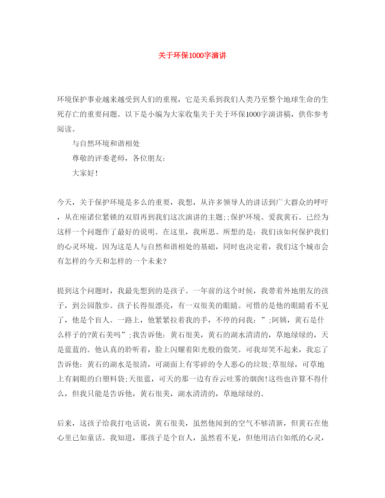 此资料由网络收集而来,如有侵权请告知上传者立即删除。资料共分享,我们负责传递知识。关于环保1000字演讲环境保护事业越来越受到人们的重视,它是关系到我们人类乃至整个地球生命的生死存亡的重要问题。以下是小编为大家收集关于关于环保1000字演讲稿,供你参考阅读。与自然环境和谐相处尊敬的评委老师,各位朋友:大家好!今天,关于保护环境是多么的重要,我想,从许多领导人的讲话到广大群众的呼吁,从在座诸位紧锁的双眉再到我们这次演讲的主题;;保护环境、爱我黄石。已经为这样一个问题作了最好的说明。在这里,我所思、所想的是:
