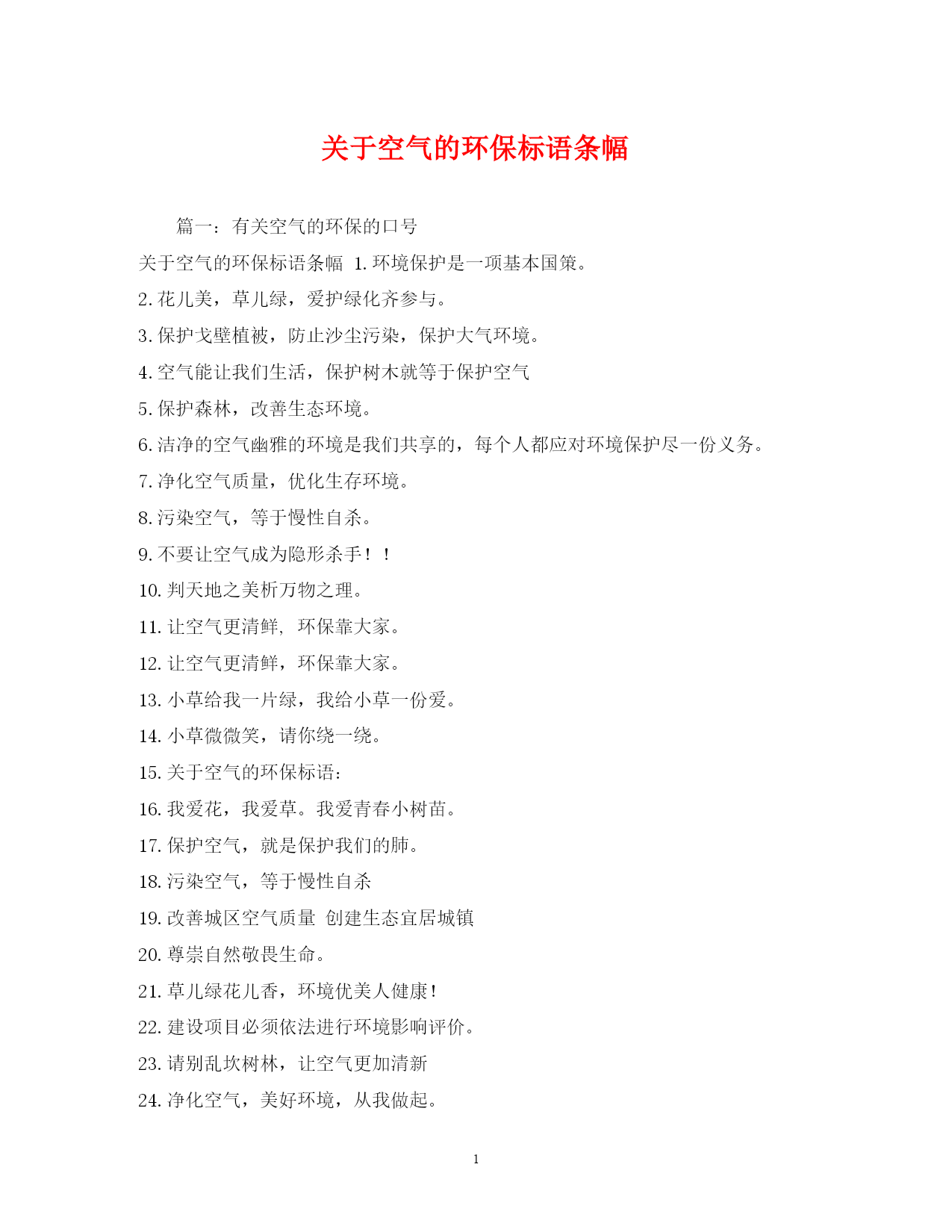 此资料由网络收集而来,如有侵权请告知上传者立即删除。资料共分享,我们负责传递知识。PAGEPAGE21关于空气的环保标语条幅篇一:有关空气的环保的口号关于空气的环保标语条幅1.环境保护是一项基本国策。2.花儿美,草儿绿,爱护绿化齐参与。3.保护戈壁植被,防止沙尘污染,保护大气环境。4.空气能让我们生活,保护树木就等于保护空气5.保护森林,改善生态环境。6.洁净的空气幽雅的环境是我们共享的,每个人都应对环境保护尽一份义务。7.净化空气质量,优化生存环境。8.污染空气,等于慢性自杀。9.不要让空气