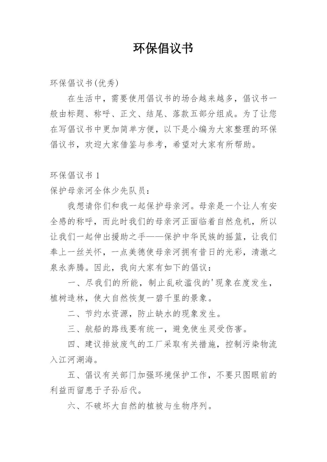 环保倡议书环保倡议书(优秀)在生活中,需要使用倡议书的场合越来越多,倡议书一般由标题、称呼、正文、结尾、落款五部分组成。为了让您在写倡议书中更加简单方便,以下是小编为大家整理的环保倡议书,欢迎大家借鉴与参考,希望对大家有所帮助。环保倡议书1保护母亲河全体少先队员:我想请你们和我一起保护母亲河。母亲是一个让人有安全感的称呼,而此时我们的母亲河正面临着自然危机,所以让我们一起伸出援助之手——保护中华民族的摇篮,让我们奉上一丝关怀,一点美德使母亲河拥有昔日的光彩,清澈之泉永奔腾。因此,我向大家有如下的倡议:一、
