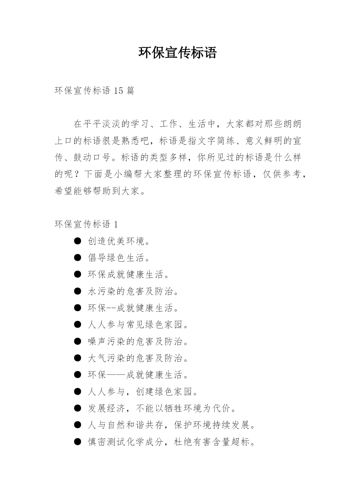 环保宣传标语环保宣传标语15篇在平平淡淡的学习、工作、生活中,大家都对那些朗朗上口的标语很是熟悉吧,标语是指文字简练、意义鲜明的宣传、鼓动口号。标语的类型多样,你所见过的标语是什么样的呢?下面是小编帮大家整理的环保宣传标语,仅供参考,希望能够帮助到大家。环保宣传标语1●创造优美环境。●倡导绿色生活。●环保成就健康生活。●水污染的危害及防治。●环保--成就健康生活。●人人参与常见绿色家园。●噪声污染的危害及防治。●大气污染的危害及防治。●环保——成就健康生活。●人人参与,创建绿色家园。●发展经济,不能以牺牲