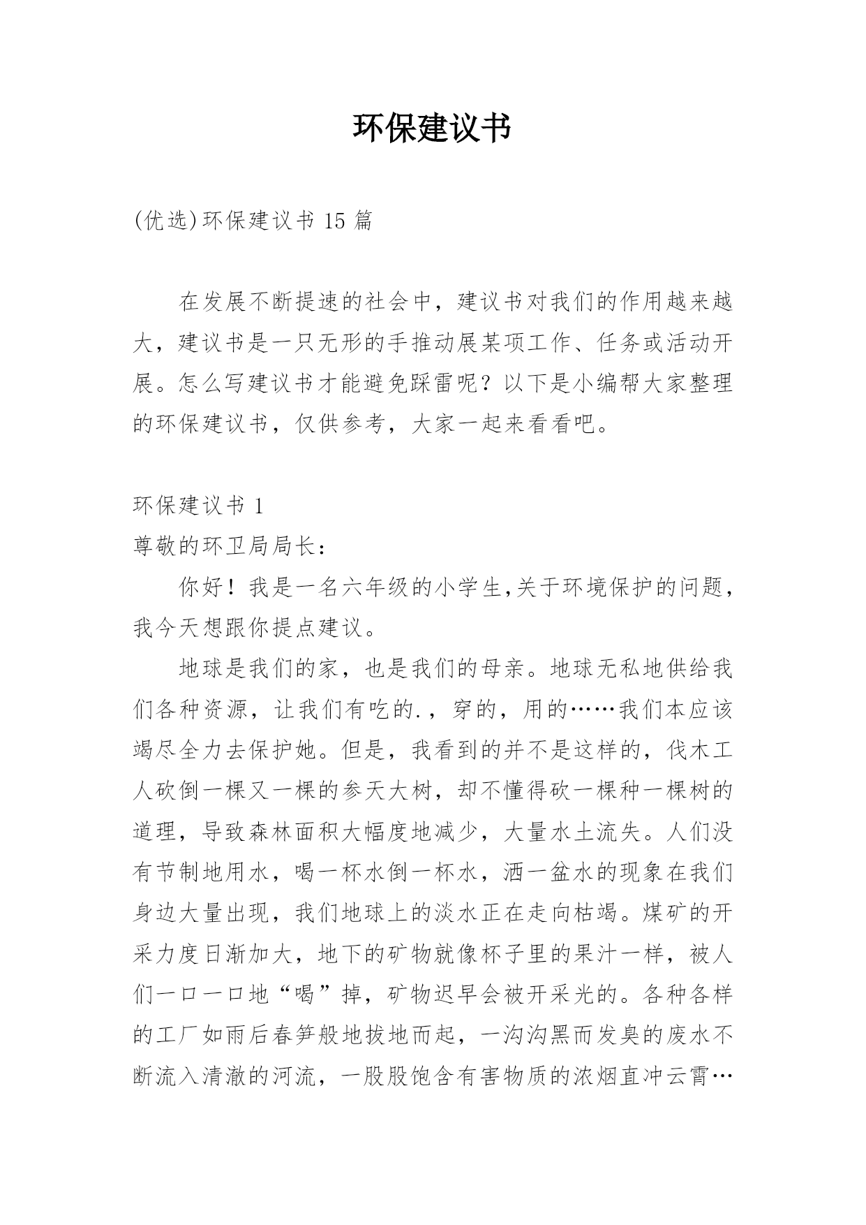 环保建议书(优选)环保建议书15篇在发展不断提速的社会中,建议书对我们的作用越来越大,建议书是一只无形的手推动展某项工作、任务或活动开展。怎么写建议书才能避免踩雷呢?以下是小编帮大家整理的环保建议书,仅供参考,大家一起来看看吧。环保建议书1尊敬的环卫局局长:你好!我是一名六年级的小学生,关于环境保护的问题,我今天想跟你提点建议。地球是我们的家,也是我们的母亲。地球无私地供给我们各种资源,让我们有吃的.,穿的,用的……我们本应该竭尽全力去保护她。但是,我看到的并不是这样的,伐木工人砍倒一棵又一棵的参天大树,