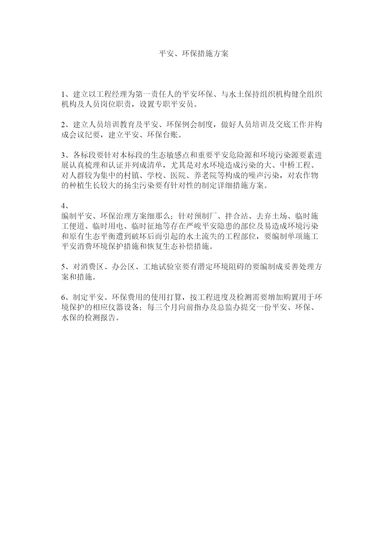 平安、环保措施方案1、建立以工程经理为第一责任人的平安环保、与水土保持组织机构健全组织机构及人员岗位职责,设置专职平安员。2、建立人员培训教育及平安、环保例会制度,做好人员培训及交底工作并构成会议纪要,建立平安、环保台账。3、各标段要针对本标段的生态敏感点和重要平安危险源和环境污染源要素进展认真梳理和认证并列成清单,尤其是对水环境造成污染的大、中桥工程、对人群较为集中的村镇、学校、医院、养老院等构成的噪声污染,对农作物的种植生长较大的扬尘污染要有针对性的制定详细措施方案。4、编制平安、环保治理方案细那么;