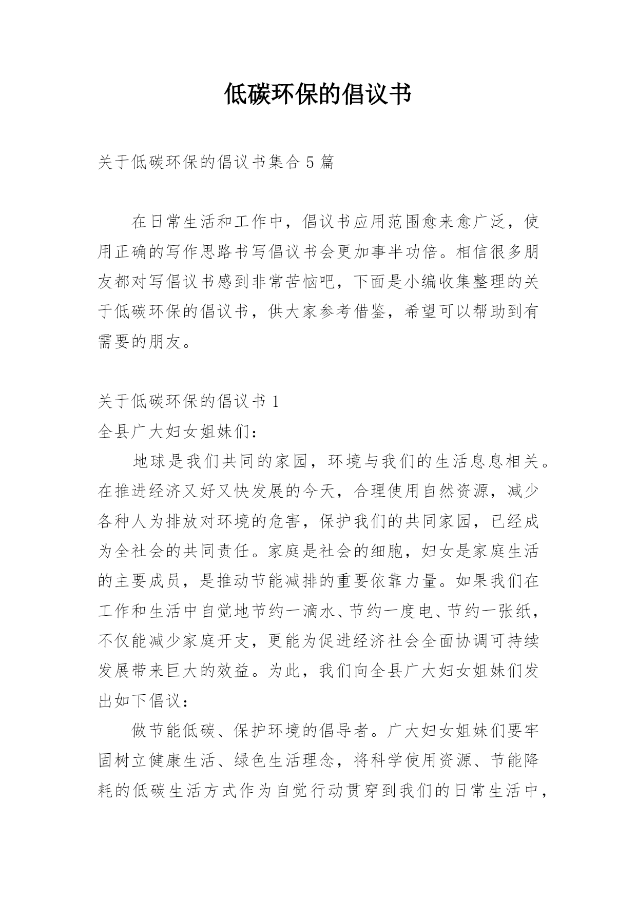 低碳环保的倡议书关于低碳环保的倡议书集合5篇在日常生活和工作中,倡议书应用范围愈来愈广泛,使用正确的写作思路书写倡议书会更加事半功倍。相信很多朋友都对写倡议书感到非常苦恼吧,下面是小编收集整理的关于低碳环保的倡议书,供大家参考借鉴,希望可以帮助到有需要的朋友。关于低碳环保的倡议书1全县广大妇女姐妹们:地球是我们共同的家园,环境与我们的生活息息相关。在推进经济又好又快发展的今天,合理使用自然资源,减少各种人为排放对环境的危害,保护我们的共同家园,已经成为全社会的共同责任。家庭是社会的细胞,妇女是家庭生活的主