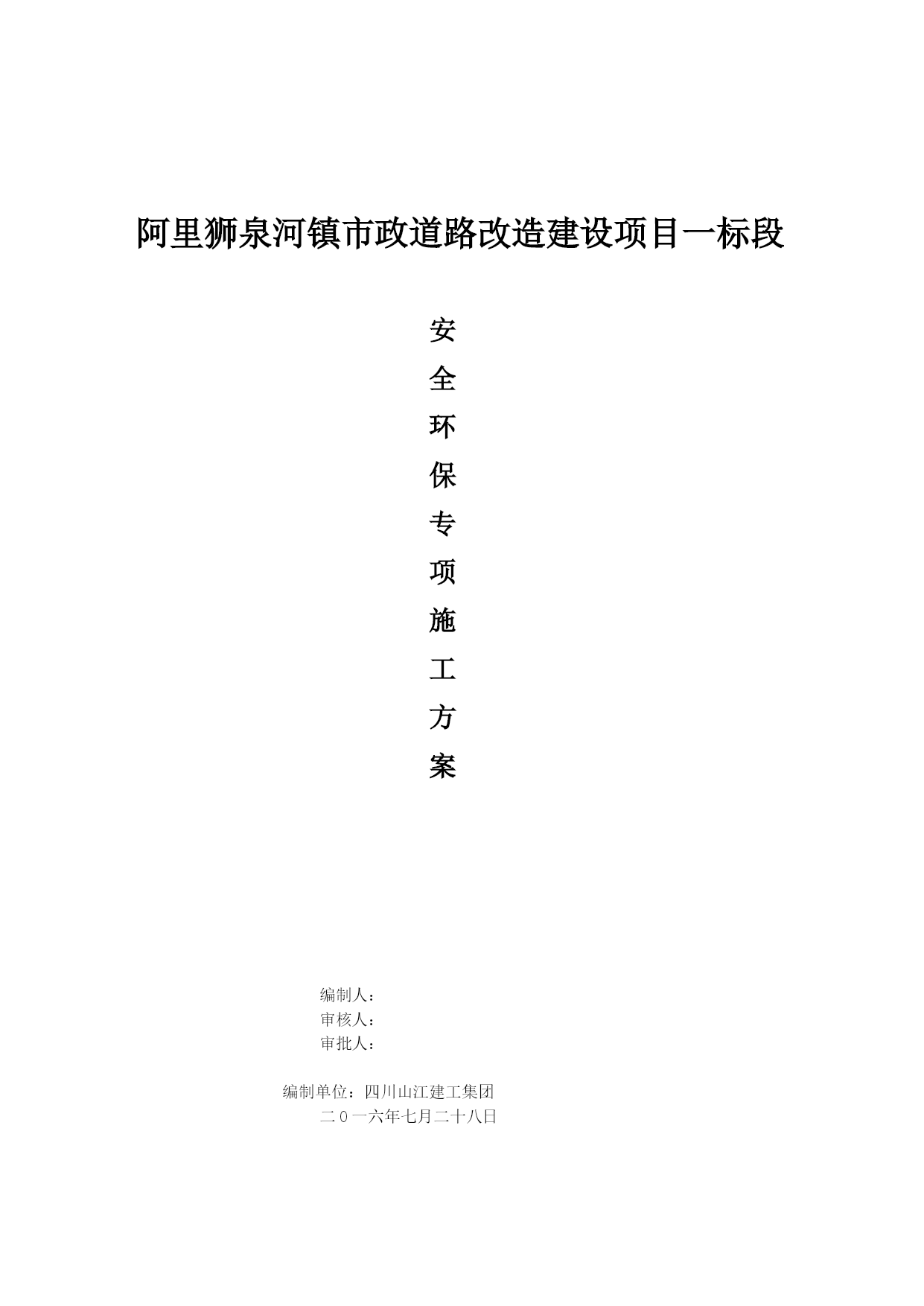 阿里狮泉河镇市政道路改造建设项目一标段安全环保专项施工方案编制人:审核人:审批人:编制单位:四川山江建工集团二0一六年七月二十八日一、工程概述狮泉河镇市政道路由于市政管网改造工程破坏、以及道路破损,严重影响行车的舒适和市民的出行,生活质量。市政道路的改造方便沿线居民的出行,改善市民生活环境,同时将进一步改善城市基础设施,提高阿里的景观面貌和特征,表现出城市的气质风格。从而更加提高城市的道路质量、提升环境品质、曾润文化气氛,深化场所与人的亲和力,柔化、淡化构筑物个人带来的负面影响,使人、环境、自然、社会趋于