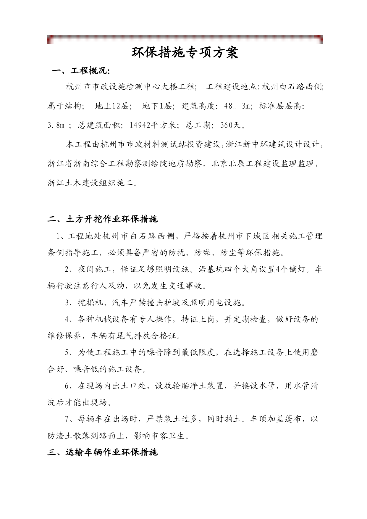 环保措施专项方案一、工程概况:杭州市市政设施检测中心大楼工程;工程建设地点:杭州白石路西侧;属于结构;地上12层;地下1层;建筑高度:48。3m;标准层层高:3.8m;总建筑面积:14942平方米;总工期:360天。本工程由杭州市市政材料测试站投资建设,浙江新中环建筑设计设计,浙江省浙南综合工程勘察测绘院地质勘察,北京北辰工程建设监理监理,浙江土木建设组织施工。二、土方开挖作业环保措施1、工程地处杭州市白石路西侧,严格按着杭州市下城区相关施工管理条例指导施工,必须具备严密的防扰、防噪、防尘等环保措施。2、