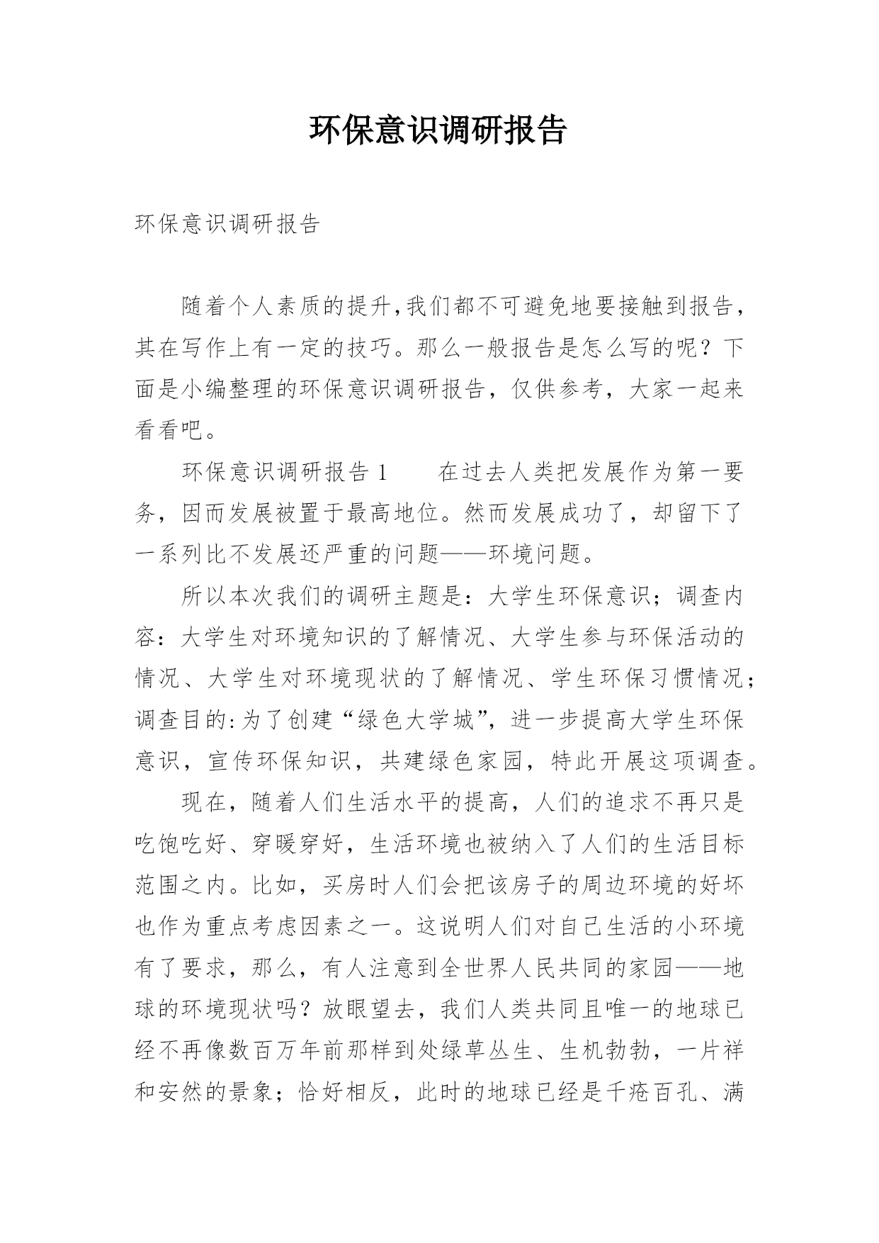 环保意识调研报告环保意识调研报告随着个人素质的提升,我们都不可避免地要接触到报告,其在写作上有一定的技巧。那么一般报告是怎么写的呢?下面是小编整理的环保意识调研报告,仅供参考,大家一起来看看吧。环保意识调研报告1在过去人类把发展作为第一要务,因而发展被置于最高地位。然而发展成功了,却留下了一系列比不发展还严重的问题——环境问题。所以本次我们的调研主题是:大学生环保意识;调查内容:大学生对环境知识的了解情况、大学生参与环保活动的情况、大学生对环境现状的了解情况、学生环保习惯情况;调查目的:为了创建“绿色大学
