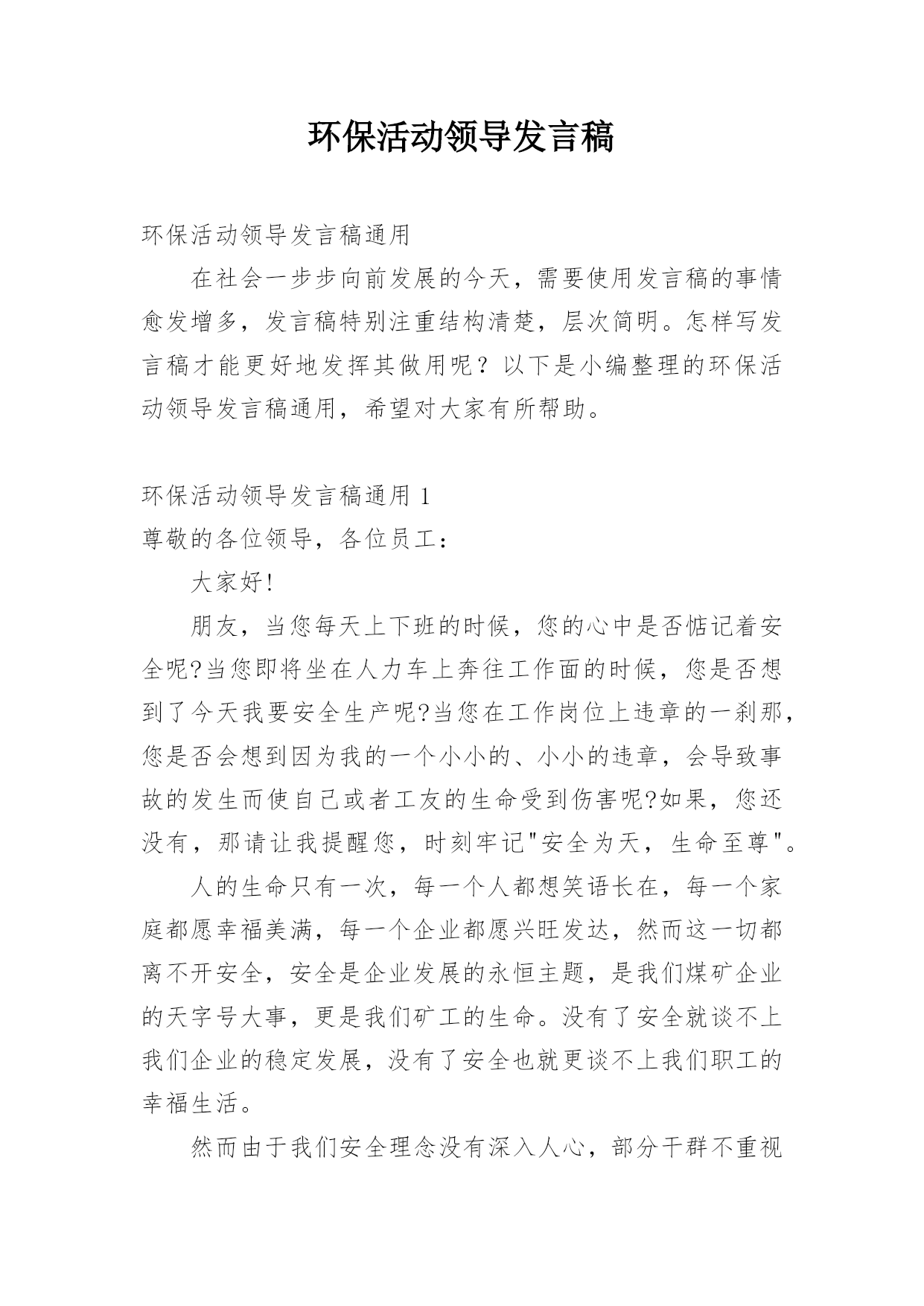 环保活动领导发言稿环保活动领导发言稿通用在社会一步步向前发展的今天,需要使用发言稿的事情愈发增多,发言稿特别注重结构清楚,层次简明。怎样写发言稿才能更好地发挥其做用呢?以下是小编整理的环保活动领导发言稿通用,希望对大家有所帮助。环保活动领导发言稿通用1尊敬的各位领导,各位员工:大家好!朋友,当您每天上下班的时候,您的心中是否惦记着安全呢?当您即将坐在人力车上奔往工作面的时候,您是否想到了今天我要安全生产呢?当您在工作岗位上违章的一刹那,您是否会想到因为我的一个小小的、小小的违章,会导致事故的发生而使自己或