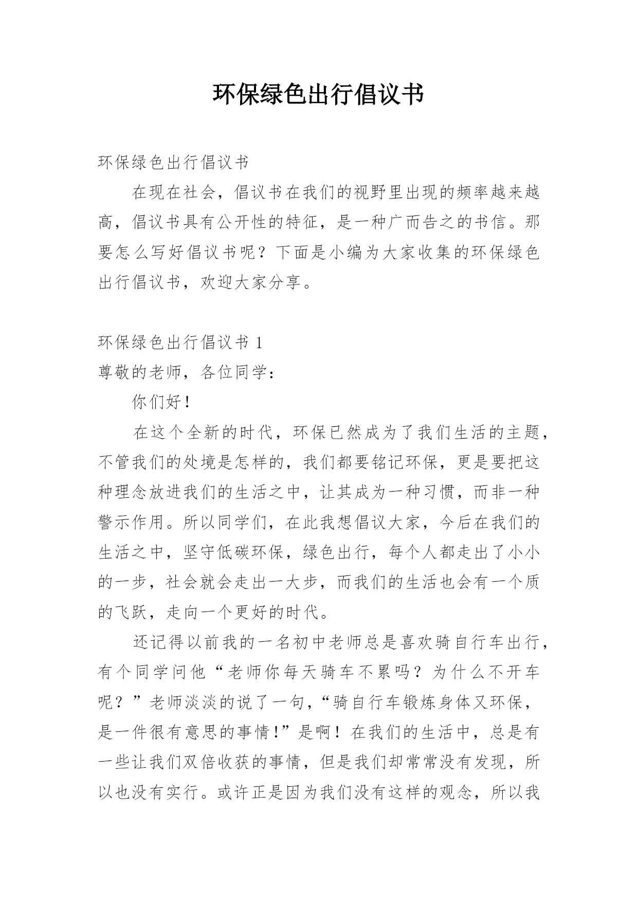 环保绿色出行倡议书环保绿色出行倡议书在现在社会,倡议书在我们的视野里出现的频率越来越高,倡议书具有公开性的特征,是一种广而告之的书信。那要怎么写好倡议书呢?下面是小编为大家收集的环保绿色出行倡议书,欢迎大家分享。环保绿色出行倡议书1尊敬的老师,各位同学:你们好!在这个全新的时代,环保已然成为了我们生活的主题,不管我们的处境是怎样的,我们都要铭记环保,更是要把这种理念放进我们的生活之中,让其成为一种习惯,而非一种警示作用。所以同学们,在此我想倡议大家,今后在我们的生活之中,坚守低碳环保,绿色出行,每个人都走
