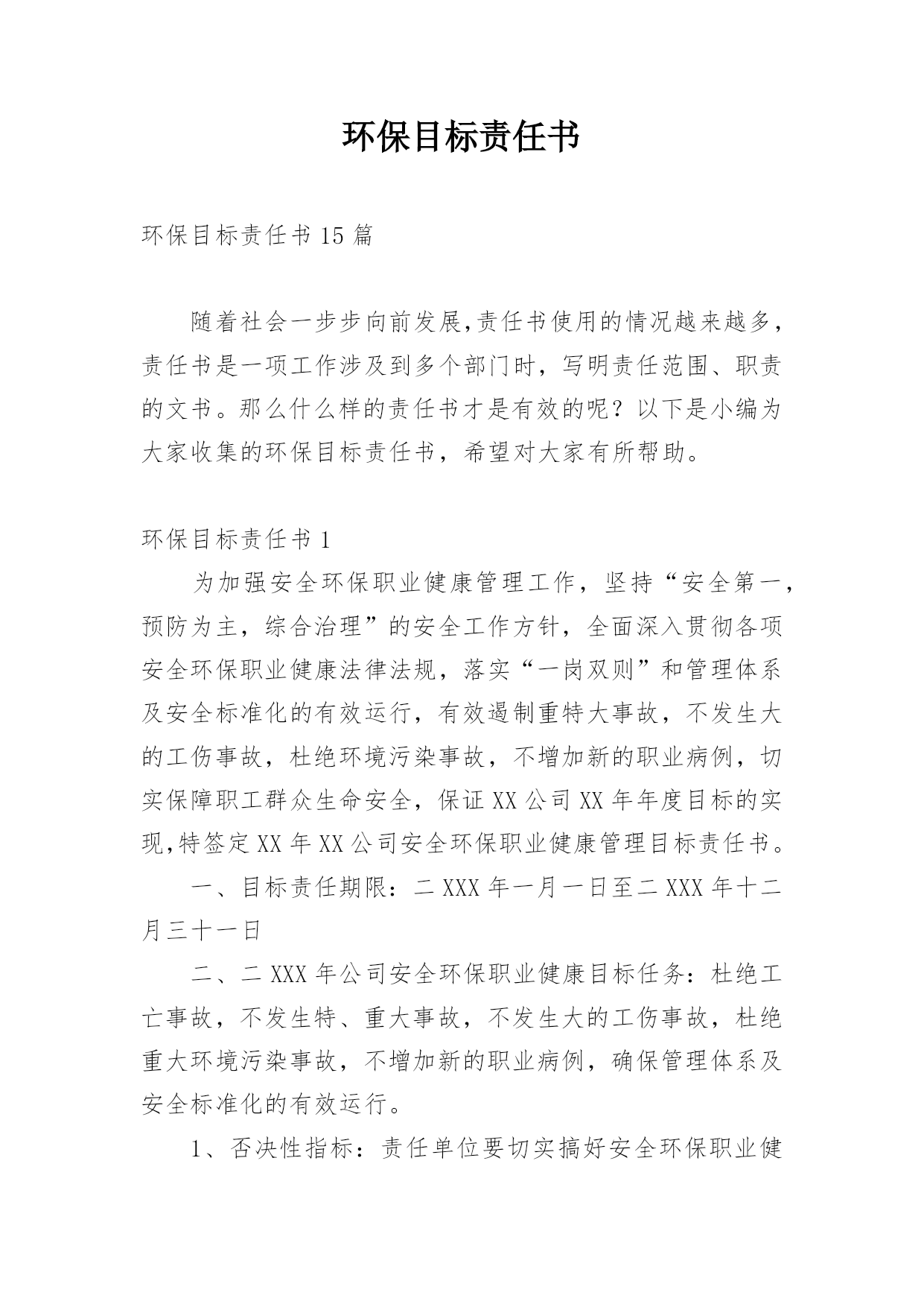 环保目标责任书环保目标责任书15篇随着社会一步步向前发展,责任书使用的情况越来越多,责任书是一项工作涉及到多个部门时,写明责任范围、职责的文书。那么什么样的责任书才是有效的呢?以下是小编为大家收集的环保目标责任书,希望对大家有所帮助。环保目标责任书1为加强安全环保职业健康管理工作,坚持“安全第一,预防为主,综合治理”的安全工作方针,全面深入贯彻各项安全环保职业健康法律法规,落实“一岗双则”和管理体系及安全标准化的有效运行,有效遏制重特大事故,不发生大的工伤事故,杜绝环境污染事故,不增加新的职业病例,切实保