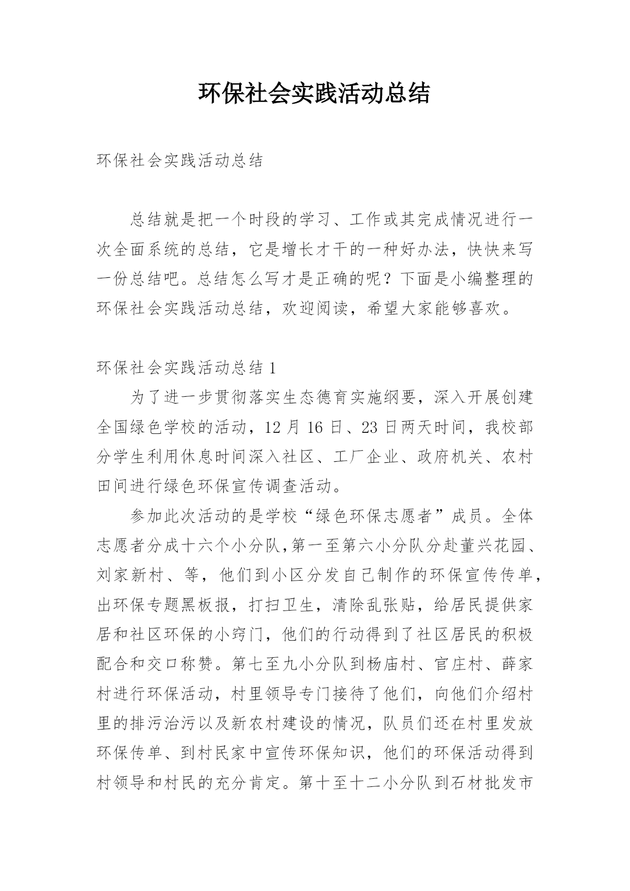 环保社会实践活动总结环保社会实践活动总结总结就是把一个时段的学习、工作或其完成情况进行一次全面系统的总结,它是增长才干的一种好办法,快快来写一份总结吧。总结怎么写才是正确的呢?下面是小编整理的环保社会实践活动总结,欢迎阅读,希望大家能够喜欢。环保社会实践活动总结1为了进一步贯彻落实生态德育实施纲要,深入开展创建全国绿色学校的活动,12月16日、23日两天时间,我校部分学生利用休息时间深入社区、工厂企业、政府机关、农村田间进行绿色环保宣传调查活动。参加此次活动的是学校“绿色环保志愿者”成员。全体志愿者分成十