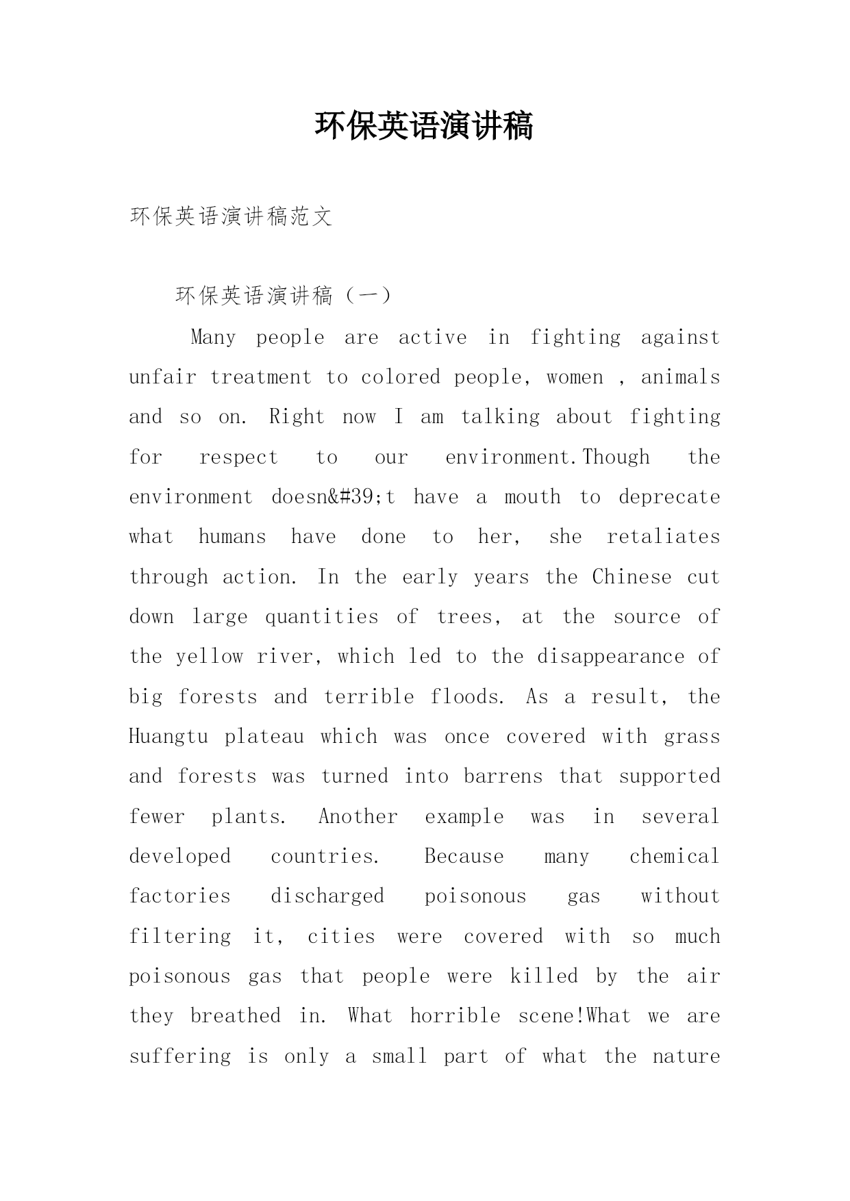 环保英语演讲稿环保英语演讲稿范文环保英语演讲稿(一)Manypeopleareactiveinfightingagainstunfairtreatmenttocoloredpeople,women,animalsandsoon.RightnowIamtalkingaboutfightingforrespecttoourenvironment.Thoughtheenvironmentdoesn'thaveamouthtodeprecatewhathumanshavedonetoher,shereta