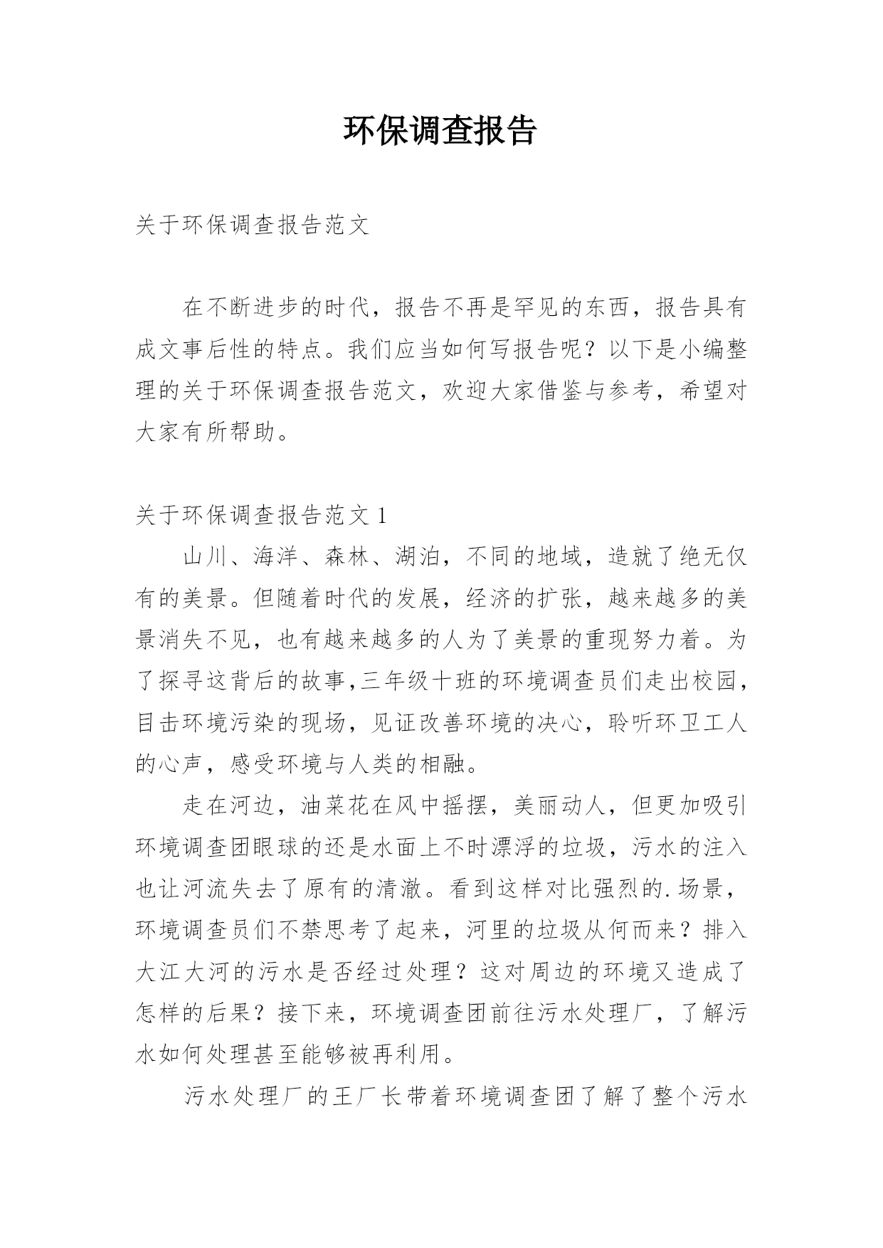 环保调查报告关于环保调查报告范文在不断进步的时代,报告不再是罕见的东西,报告具有成文事后性的特点。我们应当如何写报告呢?以下是小编整理的关于环保调查报告范文,欢迎大家借鉴与参考,希望对大家有所帮助。关于环保调查报告范文1山川、海洋、森林、湖泊,不同的地域,造就了绝无仅有的美景。但随着时代的发展,经济的扩张,越来越多的美景消失不见,也有越来越多的人为了美景的重现努力着。为了探寻这背后的故事,三年级十班的环境调查员们走出校园,目击环境污染的现场,见证改善环境的决心,聆听环卫工人的心声,感受环境与人类的相融。走