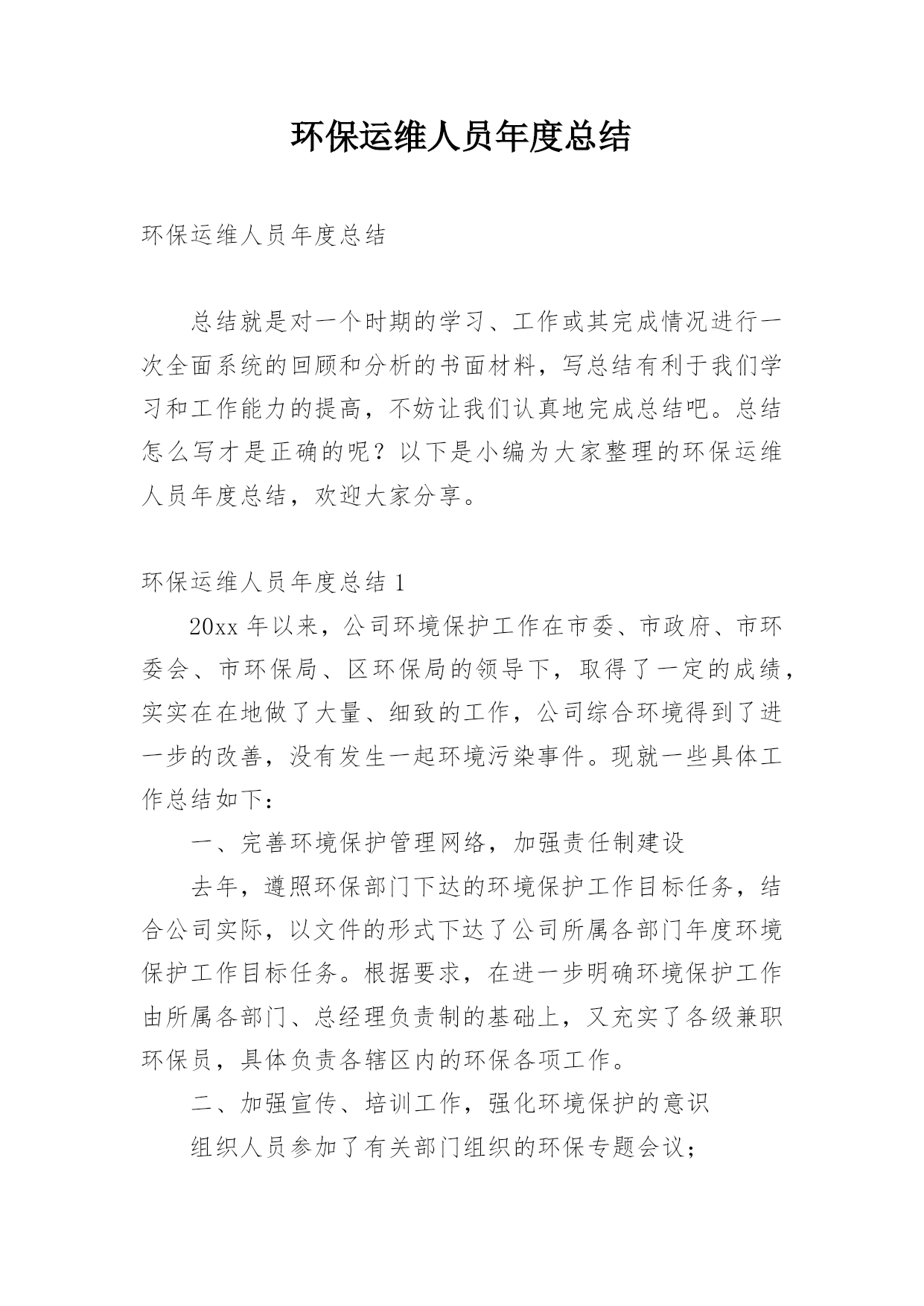 环保运维人员年度总结环保运维人员年度总结总结就是对一个时期的学习、工作或其完成情况进行一次全面系统的回顾和分析的书面材料,写总结有利于我们学习和工作能力的提高,不妨让我们认真地完成总结吧。总结怎么写才是正确的呢?以下是小编为大家整理的环保运维人员年度总结,欢迎大家分享。环保运维人员年度总结120xx年以来,公司环境保护工作在市委、市政府、市环委会、市环保局、区环保局的领导下,取得了一定的成绩,实实在在地做了大量、细致的工作,公司综合环境得到了进一步的改善,没有发生一起环境污染事件。现就一些具体工作总结如下