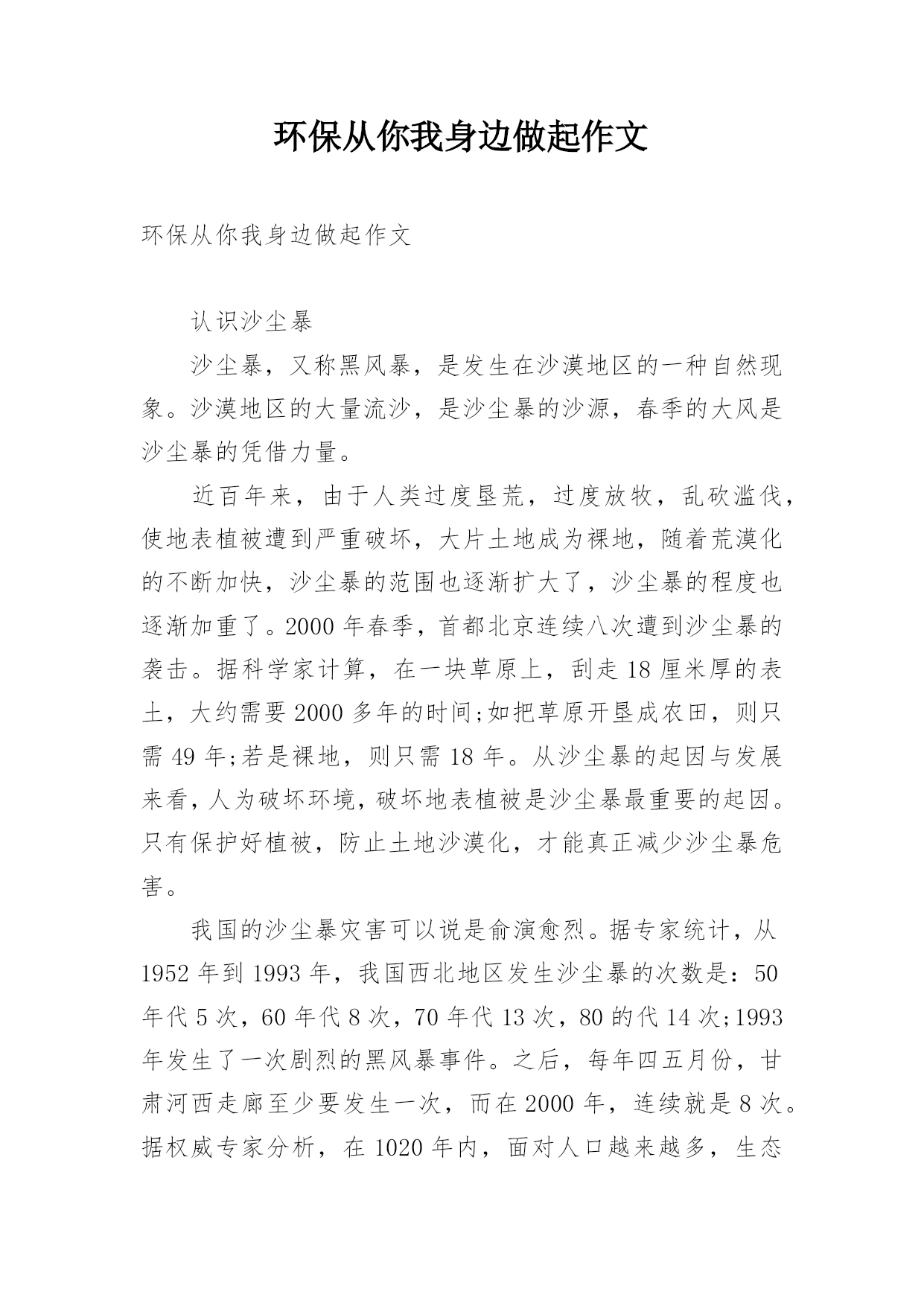 环保从你我身边做起作文环保从你我身边做起作文认识沙尘暴沙尘暴,又称黑风暴,是发生在沙漠地区的一种自然现象。沙漠地区的大量流沙,是沙尘暴的沙源,春季的大风是沙尘暴的凭借力量。近百年来,由于人类过度垦荒,过度放牧,乱砍滥伐,使地表植被遭到严重破坏,大片土地成为裸地,随着荒漠化的不断加快,沙尘暴的范围也逐渐扩大了,沙尘暴的程度也逐渐加重了。2000年春季,首都北京连续八次遭到沙尘暴的袭击。据科学家计算,在一块草原上,刮走18厘米厚的表土,大约需要2000多年的时间;如把草原开垦成农田,则只需49年;若是裸地,则