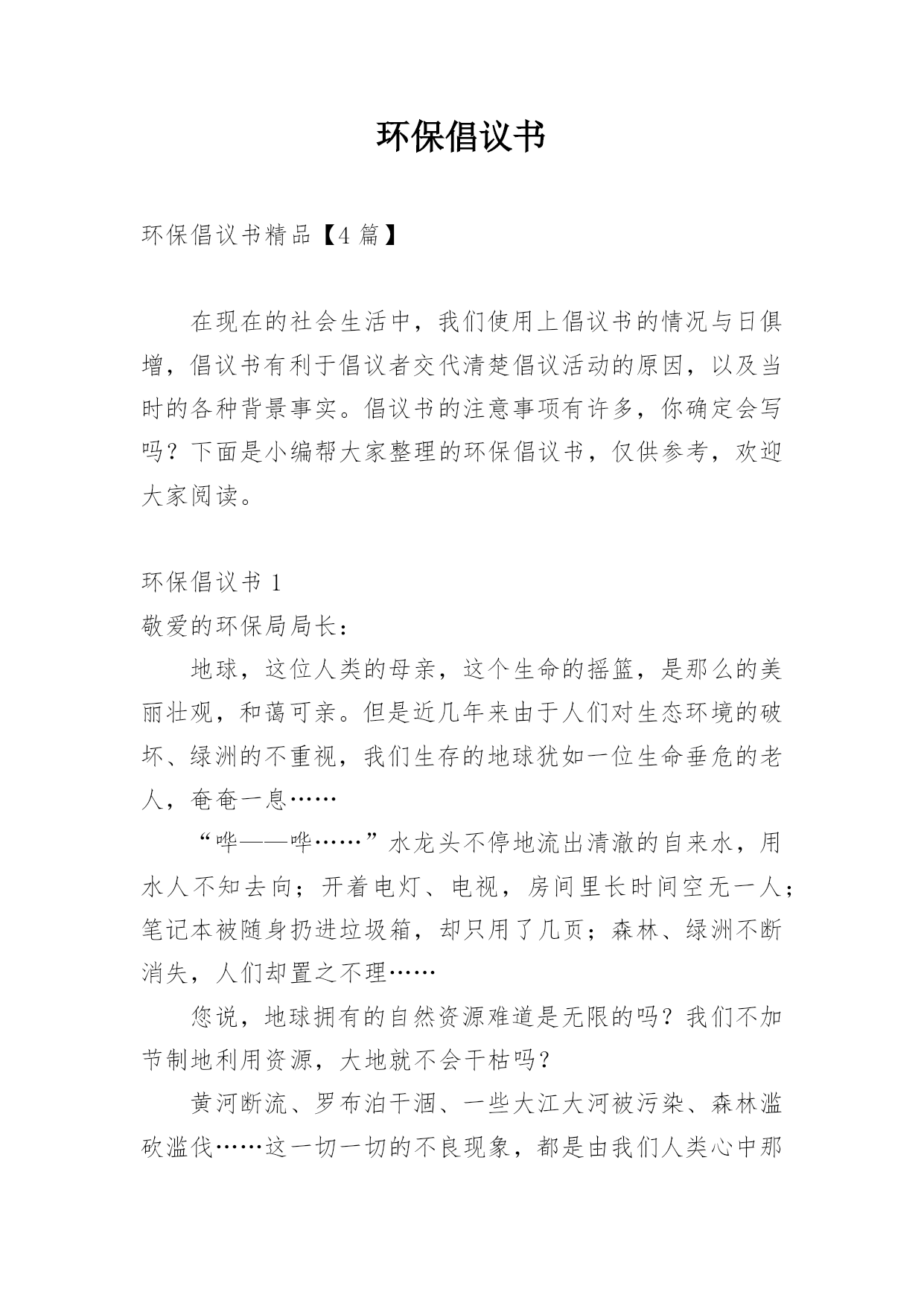 环保倡议书环保倡议书精品【4篇】在现在的社会生活中,我们使用上倡议书的情况与日俱增,倡议书有利于倡议者交代清楚倡议活动的原因,以及当时的各种背景事实。倡议书的注意事项有许多,你确定会写吗?下面是小编帮大家整理的环保倡议书,仅供参考,欢迎大家阅读。环保倡议书1敬爱的环保局局长:地球,这位人类的母亲,这个生命的摇篮,是那么的美丽壮观,和蔼可亲。但是近几年来由于人们对生态环境的破坏、绿洲的不重视,我们生存的地球犹如一位生命垂危的老人,奄奄一息……“哗——哗……”水龙头不停地流出清澈的自来水,用水人不知去向;开着