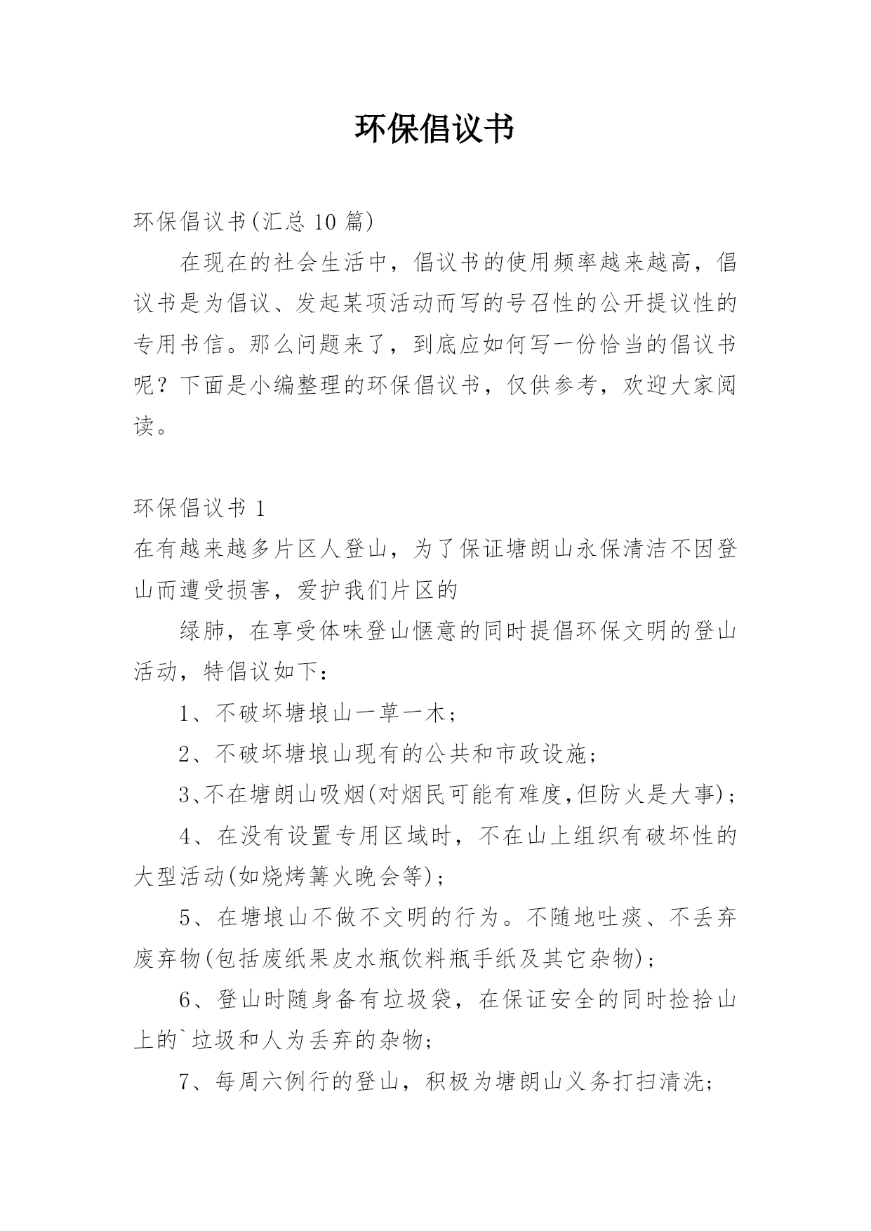 环保倡议书环保倡议书(汇总10篇)在现在的社会生活中,倡议书的使用频率越来越高,倡议书是为倡议、发起某项活动而写的号召性的公开提议性的专用书信。那么问题来了,到底应如何写一份恰当的倡议书呢?下面是小编整理的环保倡议书,仅供参考,欢迎大家阅读。环保倡议书1在有越来越多片区人登山,为了保证塘朗山永保清洁不因登山而遭受损害,爱护我们片区的绿肺,在享受体味登山惬意的同时提倡环保文明的登山活动,特倡议如下:1、不破坏塘埌山一草一木;2、不破坏塘埌山现有的公共和市政设施;3、不在塘朗山吸烟(对烟民可能有难度,但防火是