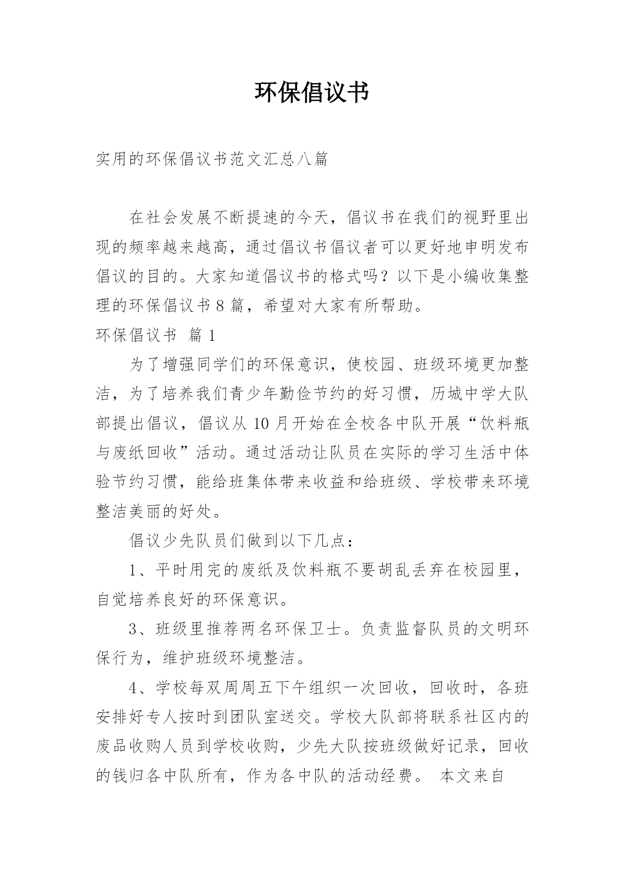环保倡议书实用的环保倡议书范文汇总八篇在社会发展不断提速的今天,倡议书在我们的视野里出现的频率越来越高,通过倡议书倡议者可以更好地申明发布倡议的目的。大家知道倡议书的格式吗?以下是小编收集整理的环保倡议书8篇,希望对大家有所帮助。环保倡议书篇1为了增强同学们的环保意识,使校园、班级环境更加整洁,为了培养我们青少年勤俭节约的好习惯,历城中学大队部提出倡议,倡议从10月开始在全校各中队开展“饮料瓶与废纸回收”活动。通过活动让队员在实际的学习生活中体验节约习惯,能给班集体带来收益和给班级、学校带来环境整洁美丽的