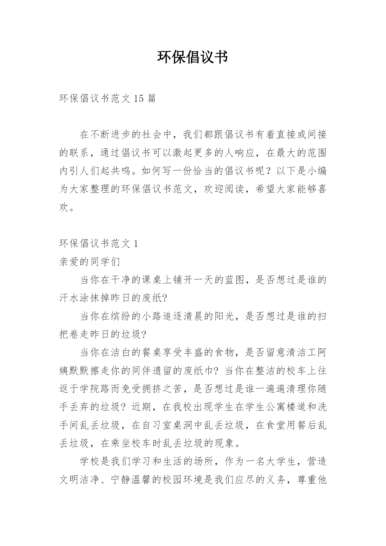 环保倡议书环保倡议书范文15篇在不断进步的社会中,我们都跟倡议书有着直接或间接的联系,通过倡议书可以激起更多的人响应,在最大的范围内引人们起共鸣。如何写一份恰当的倡议书呢?以下是小编为大家整理的环保倡议书范文,欢迎阅读,希望大家能够喜欢。环保倡议书范文1亲爱的同学们当你在干净的课桌上铺开一天的蓝图,是否想过是谁的汗水涂抹掉昨日的废纸?当你在缤纷的小路追逐清晨的阳光,是否想过是谁的扫把卷走昨日的垃圾?当你在洁白的餐桌享受丰盛的食物,是否留意清洁工阿姨默默擦走你的同伴遗留的废纸巾?当你在整洁的校车上往返于学院