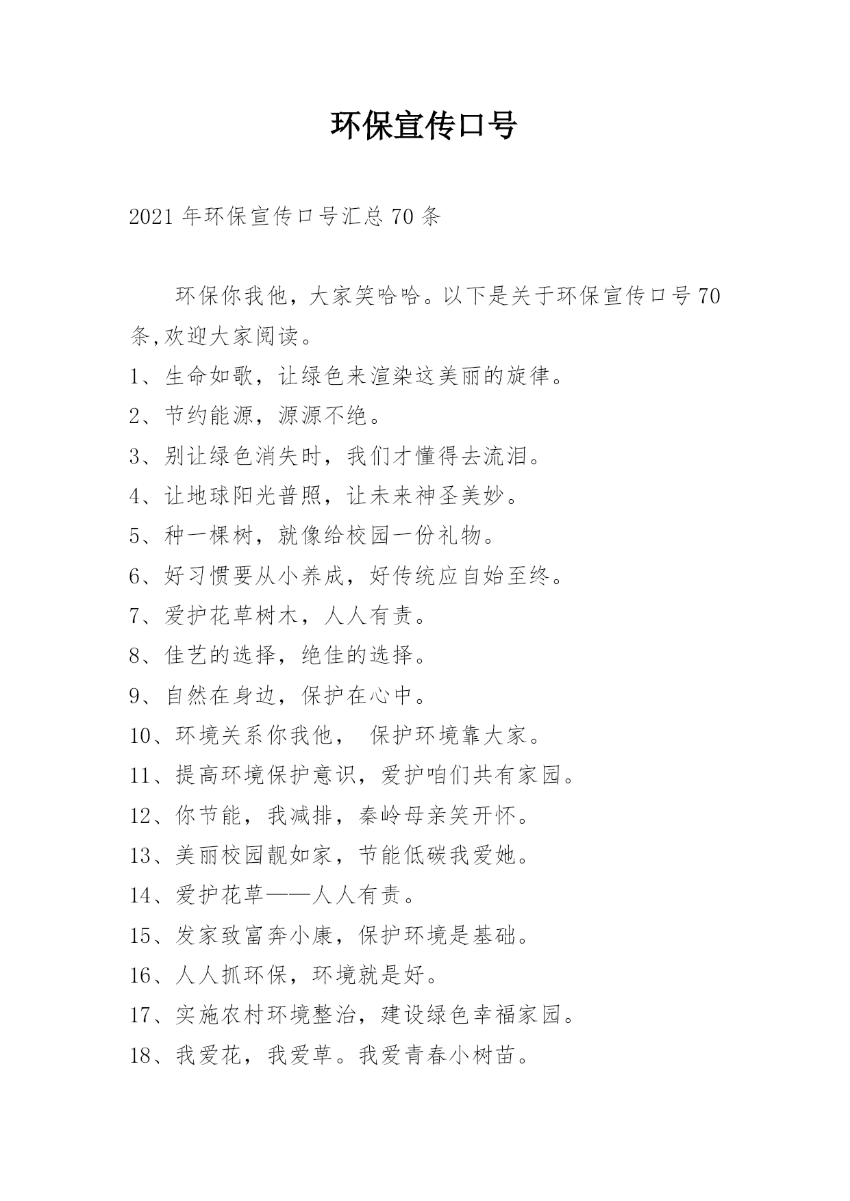 环保宣传口号2021年环保宣传口号汇总70条环保你我他,大家笑哈哈。以下是关于环保宣传口号70条,欢迎大家阅读。1、生命如歌,让绿色来渲染这美丽的旋律。2、节约能源,源源不绝。3、别让绿色消失时,我们才懂得去流泪。4、让地球阳光普照,让未来神圣美妙。5、种一棵树,就像给校园一份礼物。6、好习惯要从小养成,好传统应自始至终。7、爱护花草树木,人人有责。8、佳艺的选择,绝佳的选择。9、自然在身边,保护在心中。10、环境关系你我他,保护环境靠大家。11、提高环境保护意识,爱护咱们共有家园。12、你节能,我减排,