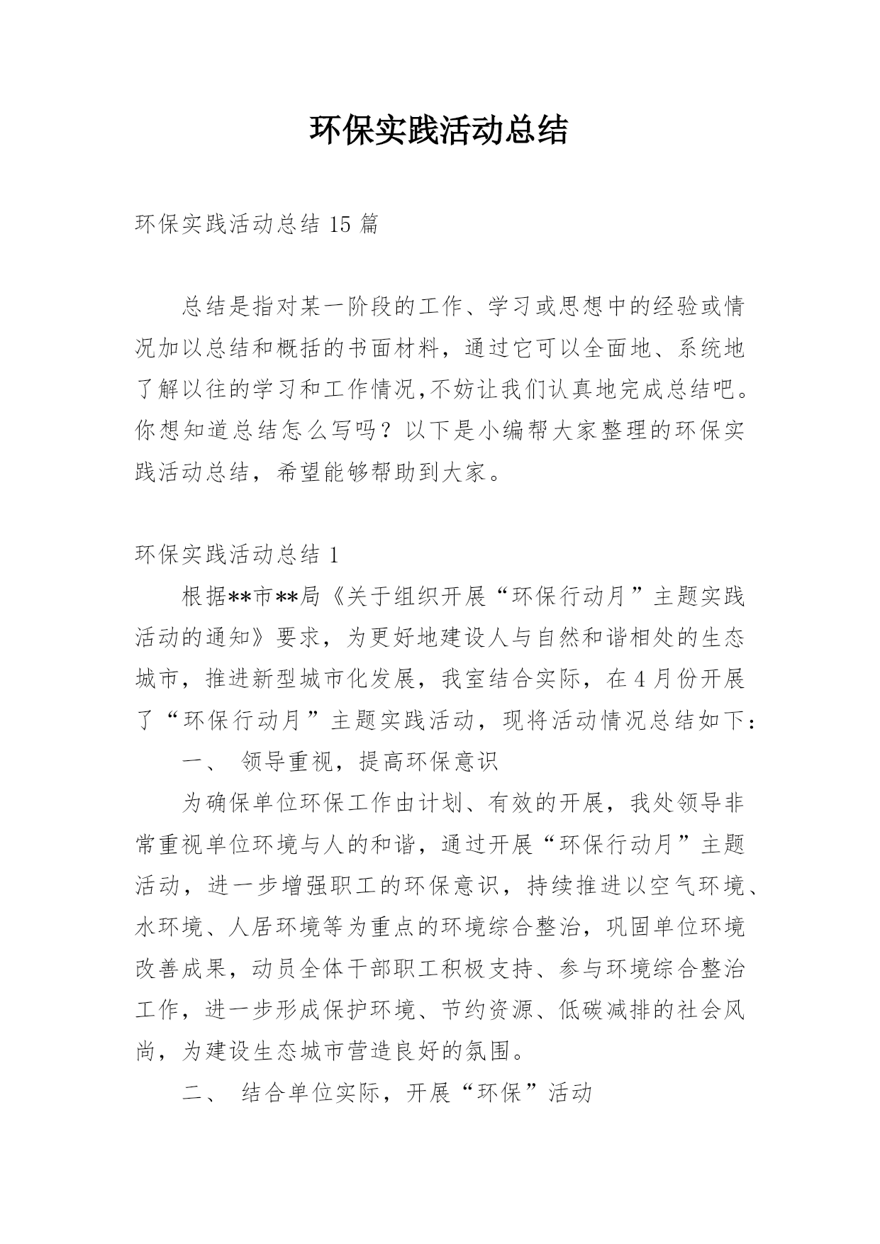 环保实践活动总结环保实践活动总结15篇总结是指对某一阶段的工作、学习或思想中的经验或情况加以总结和概括的书面材料,通过它可以全面地、系统地了解以往的学习和工作情况,不妨让我们认真地完成总结吧。你想知道总结怎么写吗?以下是小编帮大家整理的环保实践活动总结,希望能够帮助到大家。环保实践活动总结1根据**市**局《关于组织开展“环保行动月”主题实践活动的通知》要求,为更好地建设人与自然和谐相处的生态城市,推进新型城市化发展,我室结合实际,在4月份开展了“环保行动月”主题实践活动,现将活动情况总结如下:一、领导重