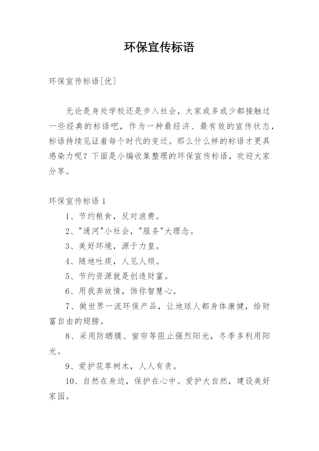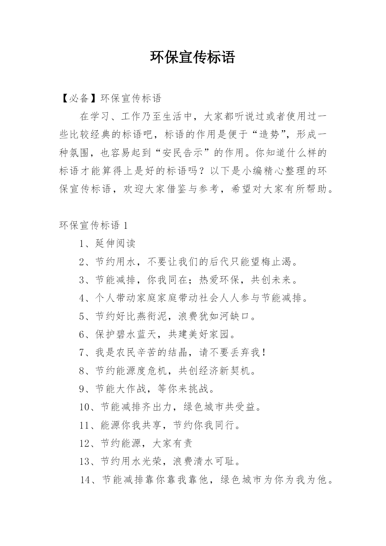 环保宣传标语【必备】环保宣传标语在学习、工作乃至生活中,大家都听说过或者使用过一些比较经典的标语吧,标语的作用是便于“造势”,形成一种氛围,也容易起到“安民告示”的作用。你知道什么样的标语才能算得上是好的标语吗?以下是小编精心整理的环保宣传标语,欢迎大家借鉴与参考,希望对大家有所帮助。环保宣传标语11、延伸阅读2、节约用水,不要让我们的后代只能望梅止渴。3、节能减排,你我同在;热爱环保,共创未来。4、个人带动家庭家庭带动社会人人参与节能减排。5、节约好比燕衔泥,浪费犹如河缺口。6、保护碧水蓝天,共建美好家
