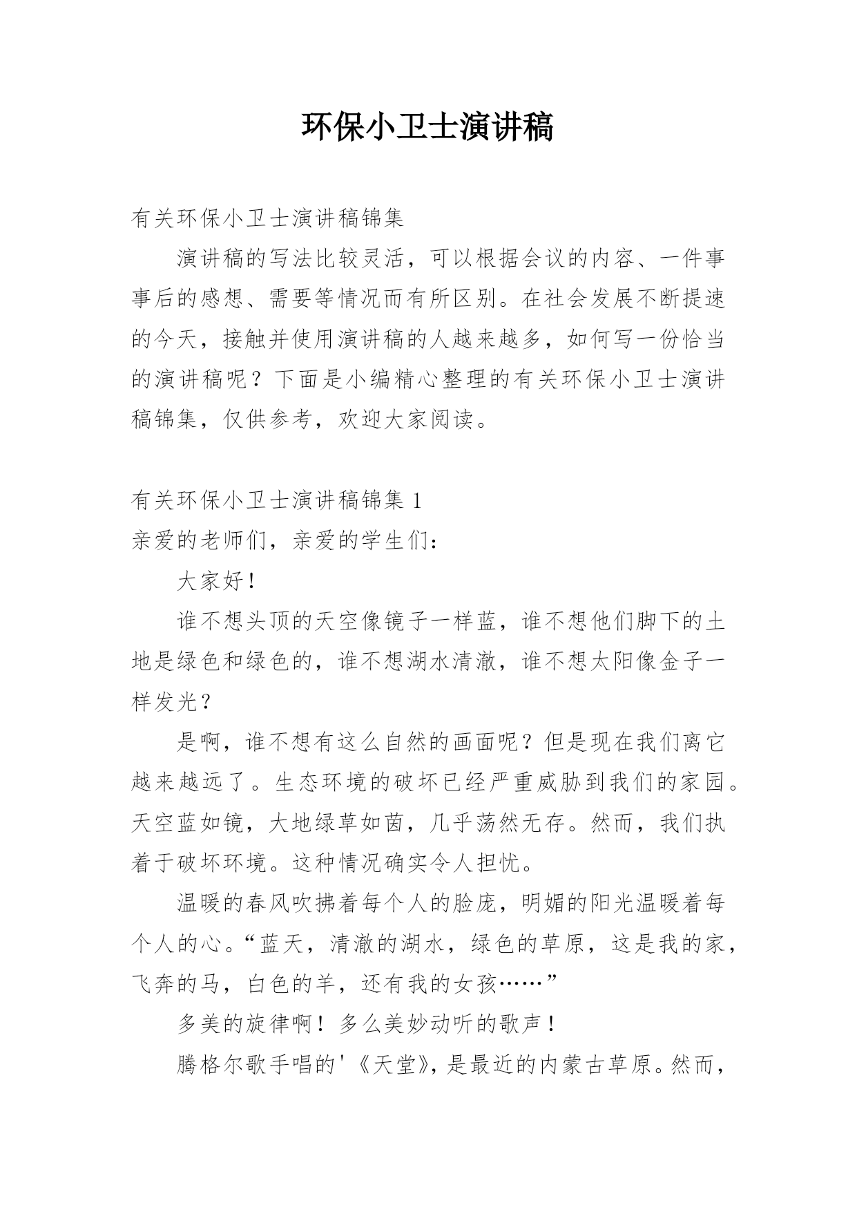 环保小卫士演讲稿有关环保小卫士演讲稿锦集演讲稿的写法比较灵活,可以根据会议的内容、一件事事后的感想、需要等情况而有所区别。在社会发展不断提速的今天,接触并使用演讲稿的人越来越多,如何写一份恰当的演讲稿呢?下面是小编精心整理的有关环保小卫士演讲稿锦集,仅供参考,欢迎大家阅读。有关环保小卫士演讲稿锦集1亲爱的老师们,亲爱的学生们:大家好!谁不想头顶的天空像镜子一样蓝,谁不想他们脚下的土地是绿色和绿色的,谁不想湖水清澈,谁不想太阳像金子一样发光?是啊,谁不想有这么自然的画面呢?但是现在我们离它越来越远了。生态环