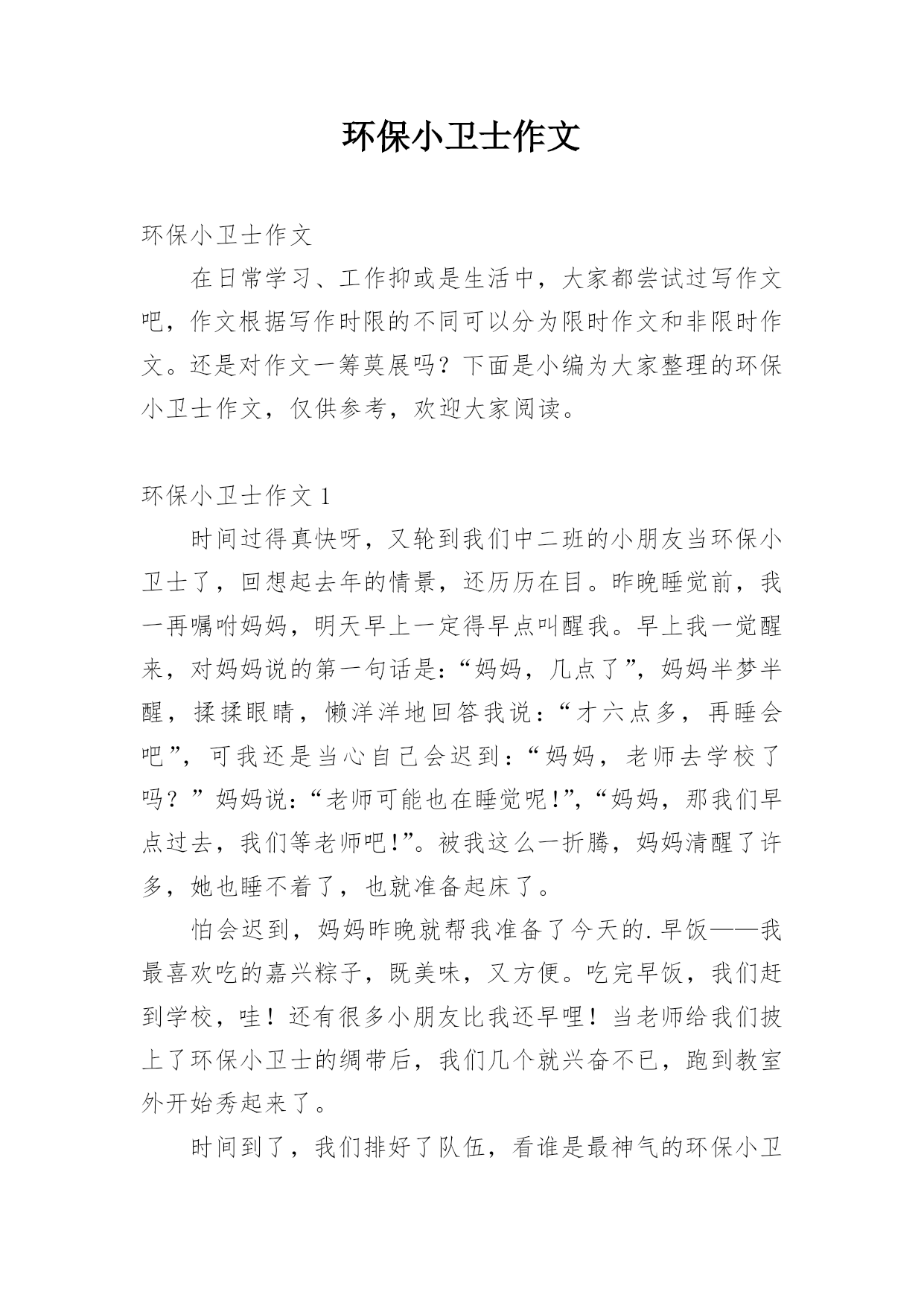 环保小卫士作文环保小卫士作文在日常学习、工作抑或是生活中,大家都尝试过写作文吧,作文根据写作时限的不同可以分为限时作文和非限时作文。还是对作文一筹莫展吗?下面是小编为大家整理的环保小卫士作文,仅供参考,欢迎大家阅读。环保小卫士作文1时间过得真快呀,又轮到我们中二班的小朋友当环保小卫士了,回想起去年的情景,还历历在目。昨晚睡觉前,我一再嘱咐妈妈,明天早上一定得早点叫醒我。早上我一觉醒来,对妈妈说的第一句话是:“妈妈,几点了”,妈妈半梦半醒,揉揉眼睛,懒洋洋地回答我说:“才六点多,再睡会吧”,可我还是当心自己