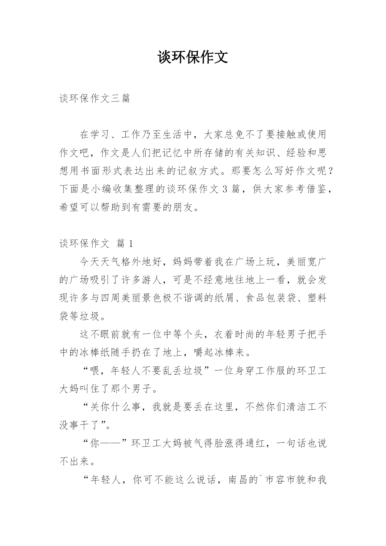谈环保作文谈环保作文三篇在学习、工作乃至生活中,大家总免不了要接触或使用作文吧,作文是人们把记忆中所存储的有关知识、经验和思想用书面形式表达出来的记叙方式。那要怎么写好作文呢?下面是小编收集整理的谈环保作文3篇,供大家参考借鉴,希望可以帮助到有需要的朋友。谈环保作文篇1今天天气格外地好,妈妈带着我在广场上玩,美丽宽广的广场吸引了许多游人,可是不经意地往地上一看,就会发现许多与四周美丽景色极不谐调的纸屑、食品包装袋、塑料袋等垃圾。这不眼前就有一位中等个头,衣着时尚的年轻男子把手中的冰棒纸随手扔在了地上,嚼起
