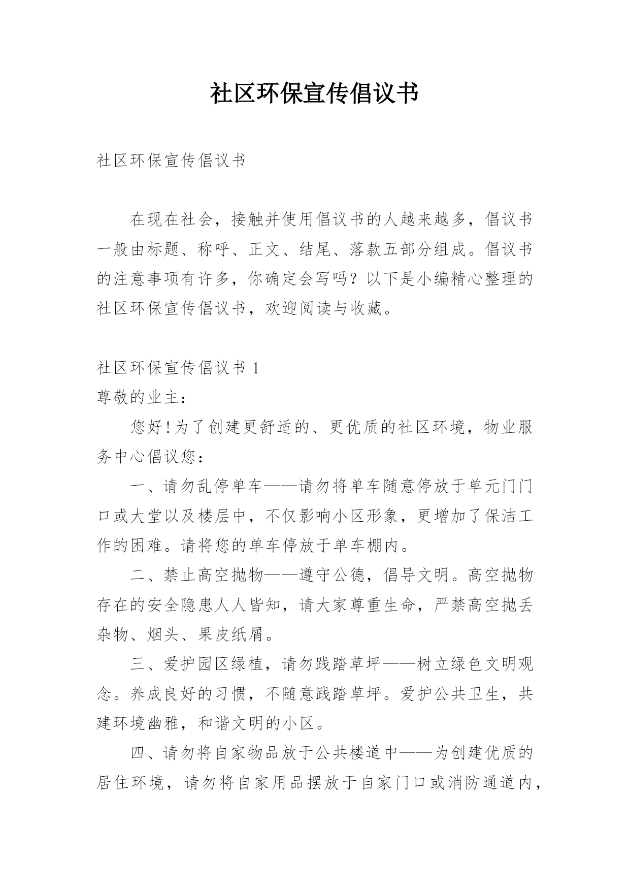 社区环保宣传倡议书社区环保宣传倡议书在现在社会,接触并使用倡议书的人越来越多,倡议书一般由标题、称呼、正文、结尾、落款五部分组成。倡议书的注意事项有许多,你确定会写吗?以下是小编精心整理的社区环保宣传倡议书,欢迎阅读与收藏。社区环保宣传倡议书1尊敬的业主:您好!为了创建更舒适的、更优质的社区环境,物业服务中心倡议您:一、请勿乱停单车——请勿将单车随意停放于单元门门口或大堂以及楼层中,不仅影响小区形象,更增加了保洁工作的困难。请将您的单车停放于单车棚内。二、禁止高空抛物——遵守公德,倡导文明。高空抛物存在的