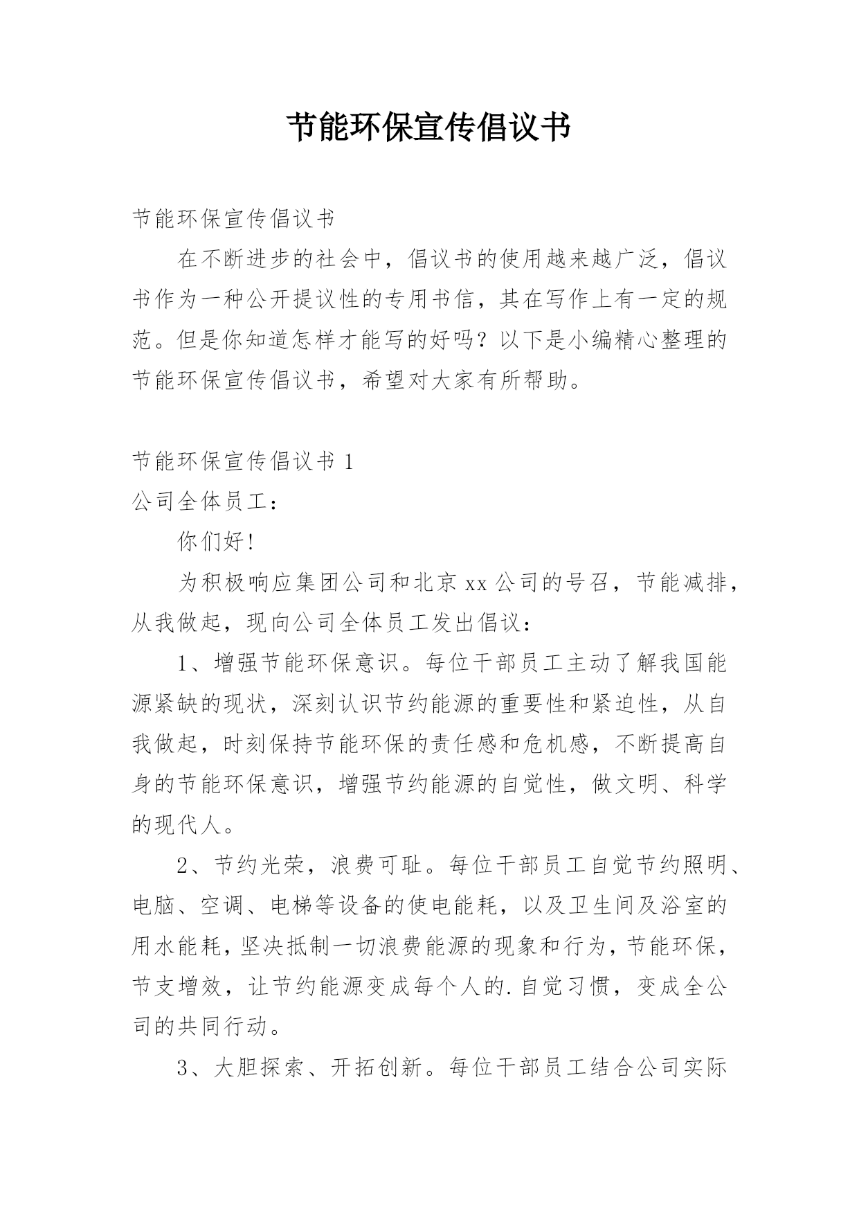 节能环保宣传倡议书节能环保宣传倡议书在不断进步的社会中,倡议书的使用越来越广泛,倡议书作为一种公开提议性的专用书信,其在写作上有一定的规范。但是你知道怎样才能写的好吗?以下是小编精心整理的节能环保宣传倡议书,希望对大家有所帮助。节能环保宣传倡议书1公司全体员工:你们好!为积极响应集团公司和北京xx公司的号召,节能减排,从我做起,现向公司全体员工发出倡议:1、增强节能环保意识。每位干部员工主动了解我国能源紧缺的现状,深刻认识节约能源的重要性和紧迫性,从自我做起,时刻保持节能环保的责任感和危机感,不断提高自身
