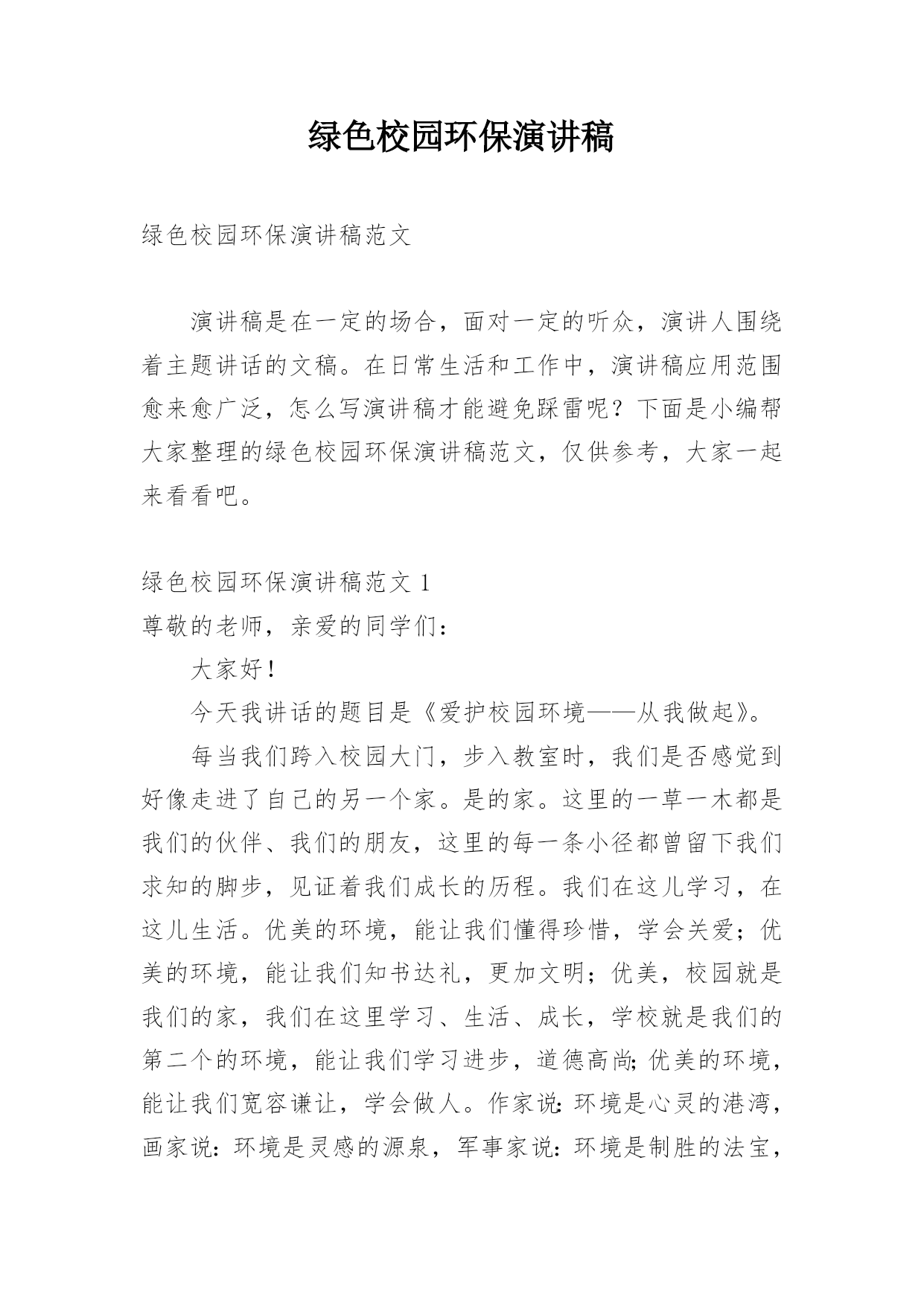 绿色校园环保演讲稿绿色校园环保演讲稿范文演讲稿是在一定的场合,面对一定的听众,演讲人围绕着主题讲话的文稿。在日常生活和工作中,演讲稿应用范围愈来愈广泛,怎么写演讲稿才能避免踩雷呢?下面是小编帮大家整理的绿色校园环保演讲稿范文,仅供参考,大家一起来看看吧。绿色校园环保演讲稿范文1尊敬的老师,亲爱的同学们:大家好!今天我讲话的题目是《爱护校园环境——从我做起》。每当我们跨入校园大门,步入教室时,我们是否感觉到好像走进了自己的另一个家。是的家。这里的一草一木都是我们的伙伴、我们的朋友,这里的每一条小径都曾留下我